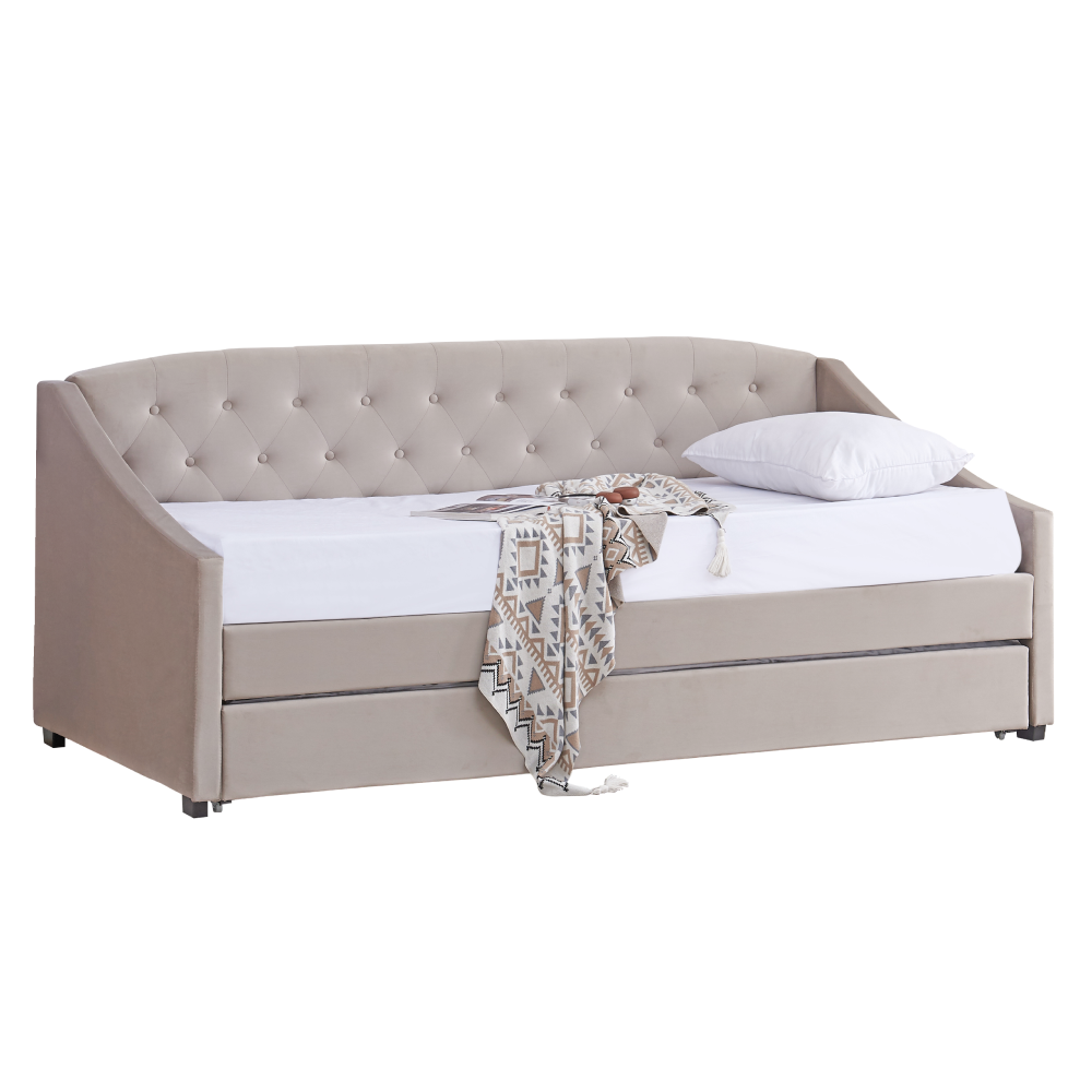 Materiál: Velvet látka/kov/pena/preglejkaOderuodolnosť textílie podľa testu Martindale: 80 000 oderovFarba: hnedosivá TaupeRozmery (ŠxHxV): 104x215x92 cmPlocha na spanie (ŠxD): 90x200 cmVýška po rošt: 40 cmNosnosť na osobu: 100 kgNa nožičkáchVýška nožičiek: 4 cmVýsuvná prístelkaPrístelka na kolieskachDodávaná s lamelovým roštomDodávané bez matracaOdporúčame zakúpiť matrac z našej ponukyOdporúčaná výška matraca: 20 cmDekoratívne prešité čelo posteleElegantnáČalúnenáDodávané v demonte