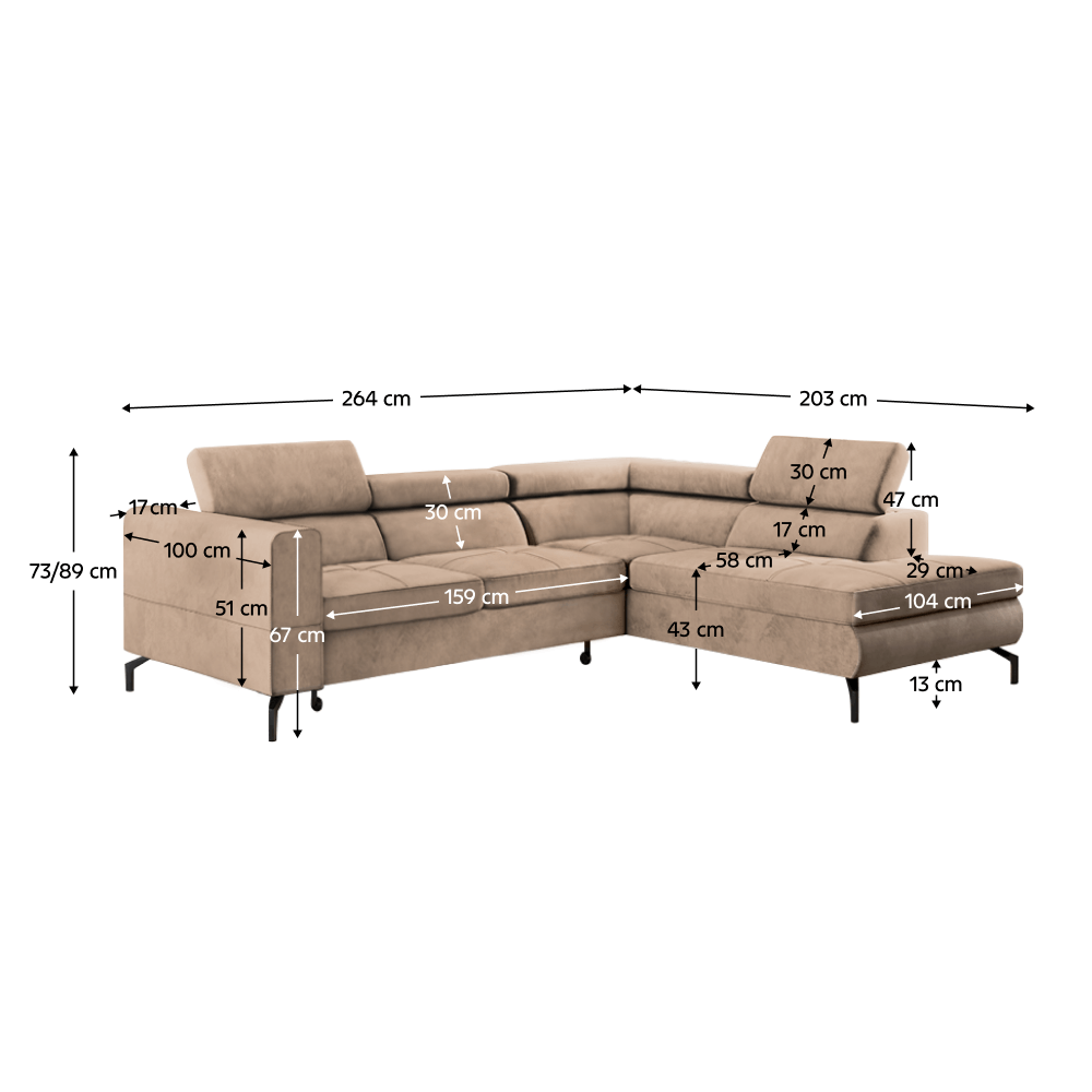 Materiál čalúnenie: látka Element 06Oderuodolnosť látky podľa testu Martindale: 50 000Farba čalúnenie: svetlohnedáRozmery (ŠxHxV): 264x203x73/89 cmPlocha na spanie (ŠxD): 125x195 cmVýška sedu: 43 cmHĺbka sedu: 58 cmŠírka sedacej časti: 159 cmRozmery opierky na ruky (ŠxHxV): 17x100x51 cmVýška spodného priestoru od podlahy: 13 cmVýška chrbtovej opierky: 30 cmNa nožičkáchMateriál nožičiek: kovFarba nožičiek: čiernaVýplň: pružina falista + Pur penaRozkladaciaRohováCeločalúnenáPravé prevedenieS úložným priestorom3 polohovacie opierky hlavy5 stupňové polohovanie opierokDodávané v demonteMožnosť objednania v 8 farebných odtieňoch látky Element v cene 1175 Eur s dodacou lehotou 6-8 týždňov. Pri individuálnej objednávke je potrebné zaplatiť 10% zálohu z danej sumy. Po uhradení zálohy bude Vaša požiadavka zadaná do výroby.