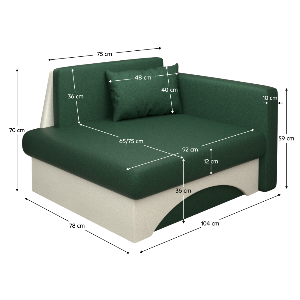 Materiál: látka Malmo 37/05Oderuodolnosť textílie podľa testu Martindale: 30 000 oderovFarba: zelená/bežováRozmery (ŠxHxV): 104x78x70 cmPlocha na spanie: 75x185 cmVýška sedu: 34,5 cmHĺbka sedu: 57 cmŠírka sedu: 92 cmVýška opierky na ruku od zeme: 59 cmRozmery opierky na chrbát (ŠxV): 75x36 cmNosnosť na osobu: 90 kgDodávané s vankúšomRozmery vankúša (ŠxV): 48x40cmRozkladacieÚložný priestorPravé prevedenieVýplň: pur pena T28Dodávané v monte