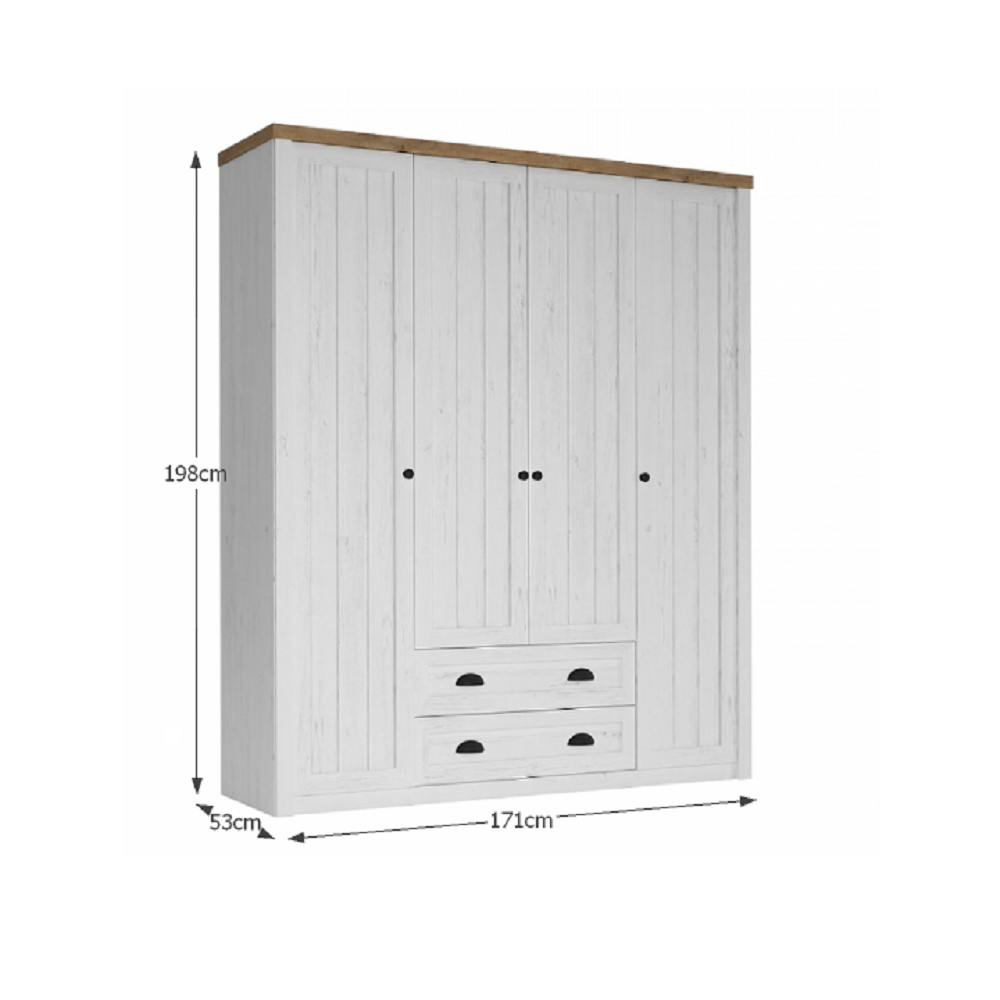 Materiál: laminovaná DTDFarba: sosna andersen/dub lefkasSkriňaRozmery (ŠxHxV): 171x53x198 cm4-dverováJedna vešiaková časťDve policové častiDve zásuvkyNosnosť vešiakovej tyče: 10 kgNosnosť každej police: 7 kgPosteľRozmery (ŠxHxV): 165x205x100 cmPlocha na spanie: 160x200 cmRošt je súčasťou baleniaHrúbka materiálu posteľ: 22 mmNočný stolíkRozmery (ŠxHxV): 51x43x45 cmHrúbka materiálu korpus: 15 mmHrúbka materiálu hornej dosky: 36 mmDodávané v demonte