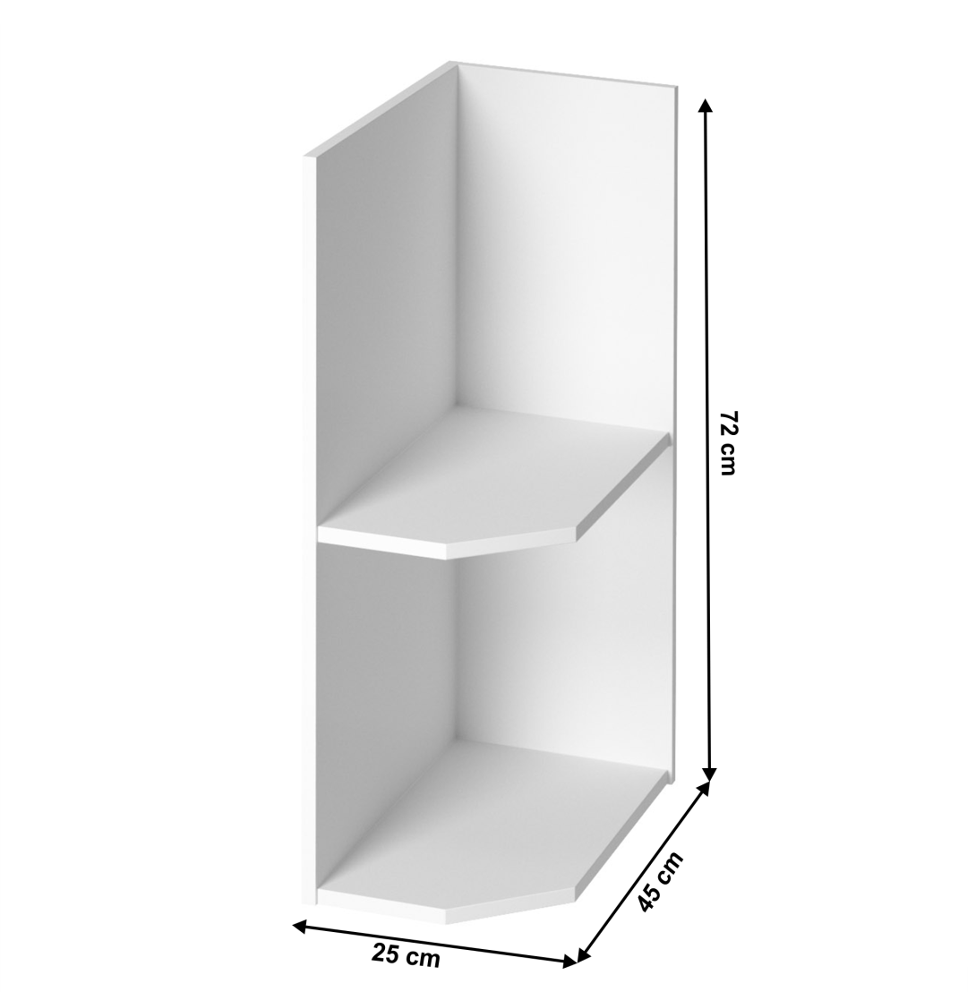 Spodná rohová skrinka s dvomi policami, ROYAL D25PZ, praváMateriál: korpus je vyrobený z kvalitnej laminovanej drevotrieskyFarba: bielaRozmery ŠxHxV: 25x45/60x72 cm Hrúbka materiálu: 15 mmDodávané v demonte.Spodné skrinky ku kuchyni ROYAL sú dodávané bez pracovnej dosky a bez sokla. Pracovnú dosku Dub Porterhouse tmavý možné doobjednať v hrúbke 3,8 cm v cene 59 Eur/1 bm. Ku každej dolnej skrinke, okrem rohových skriniek D25PZ, je potrebné doobjednať aj sokel v prevedení dub divoký v cene 10 ur/1 bm a 2 kusy úchytov na sokel v cene 1 Eur/2 ks. Objednávku vpíšte do poznámky v objednávkovom formulári.