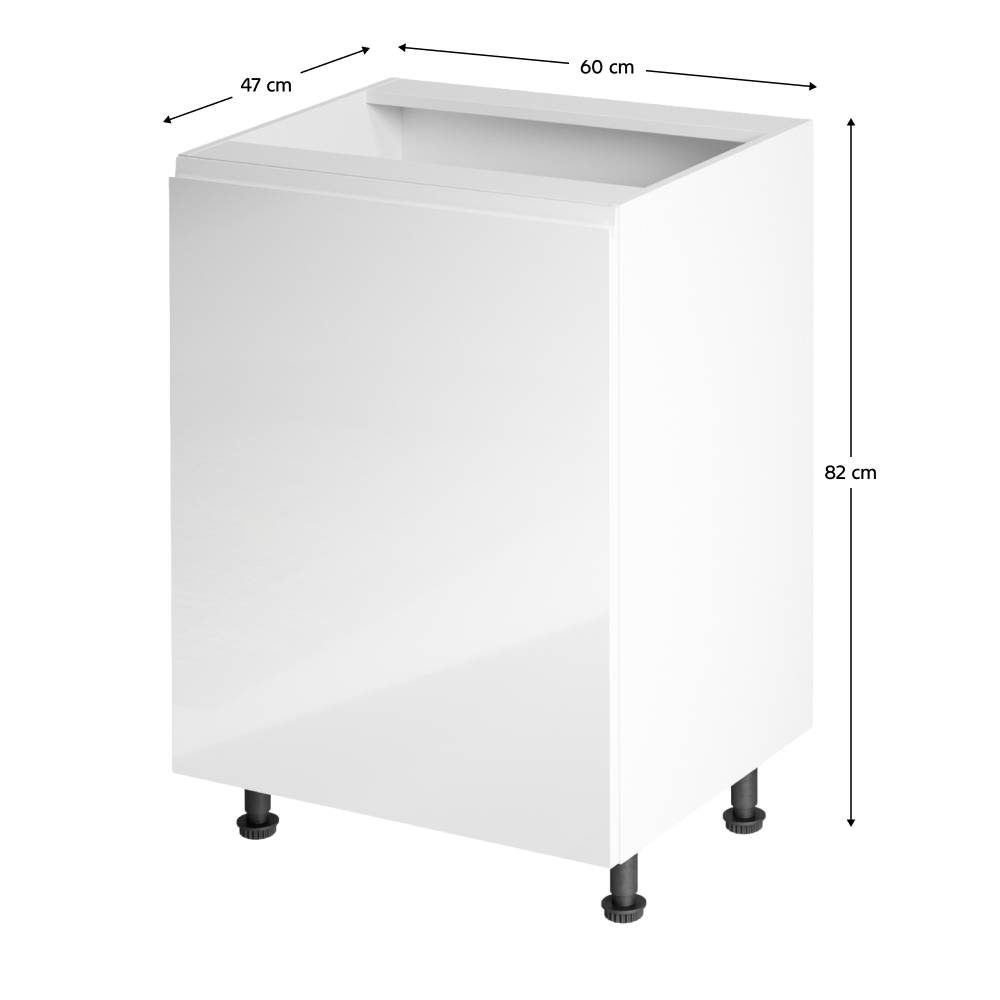 Spodná skrinka, Aurora D601FPrevedenie: DTD laminová/MDFFarba: biela/biela extra vysoký leskRozmery (ŠxHxV): 60x47x82 cmHrúbka materiálu: 15 mmSystém tichého zatvárania dvierokJe nutné objednať potrebný počet ukončení spodnej lištyPracovná doska nie je súčasťou skriniek. Je možné si doobjednať pracovnú dosku v prevedení dub artisan s hrúbkou 38 mm za 56 eur/bm. Možnosť dokúpiť drez LAY ON. Spodné skrinky sú dodávané vrátane dolnej lišty, avšak presný rozmer, ktorý potrebujete, je potrebné uviesť do poznámky v objednávke. Ak rozmer neuvediete, môže sa stať, že vám sokel nebude dodaný. Ku každej dolnej skrinke, okrem D25PZ, je potrebné doobjednať 2 ks úchytok na sokel - cena 1Eur/2ks.