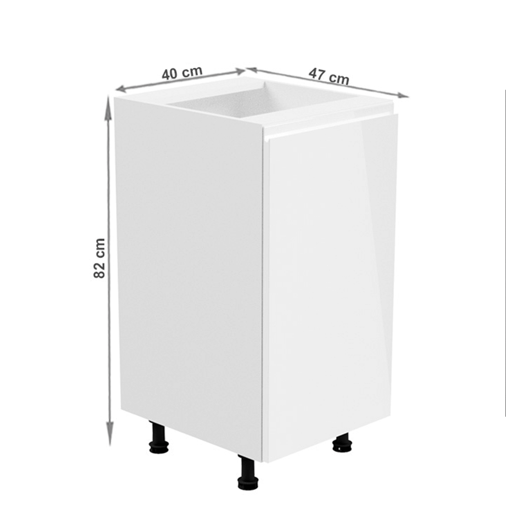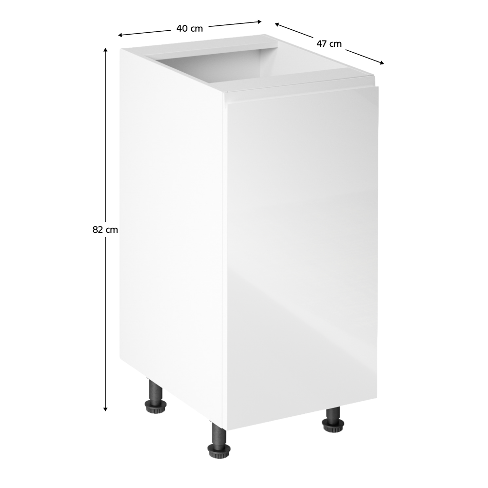 Spodná skrinka, Aurora D40Prevedenie: DTD laminová/MDFFarba: biela/biela extra vysoký leskRozmery (ŠxHxV): 40x47x82 cmHrúbka materiálu: 15 mmSystém tichého zatvárania dvierokJe nutné objednať potrebný počet ukončení spodnej lištyUkončenie spodnej lišty je súčasťou balenia, treba si však zvlásť objednať potrebný počet, túto informáciu treba uviesť do Poznámky v objednávkovom formulári.Pracovná doska nie je súčasťou skriniek. Je možné si doobjednať pracovnú dosku v prevedení dub artisan s hrúbkou 38 mm za 56 eur/bm. Možnosť dokúpiť drez LAY ON. Spodné skrinky sú dodávané vrátane dolnej lišty, avšak presný rozmer, ktorý potrebujete, je potrebné uviesť do poznámky v objednávke. Ak rozmer neuvediete, môže sa stať, že vám sokel nebude dodaný. Ku každej dolnej skrinke, okrem D25PZ, je potrebné doobjednať 2 ks úchytok na sokel - cena 1Eur/2ks.