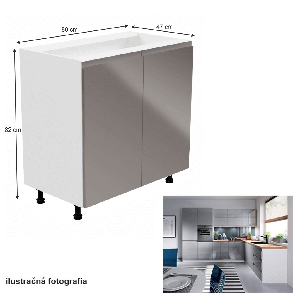 Spodná skrinka, Aurora D80Prevedenie: DTD laminová/MDFFarba: biela/biela extra vysoký leskRozmery (ŠxHxV): 80x47x82 cmHrúbka materiálu: 15 mmSystém tichého zatvárania dvierokJe nutné objednať potrebný počet ukončení spodnej lištyPracovná doska nie je súčasťou skriniek. Je možné si doobjednať pracovnú dosku v prevedení dub artisan s hrúbkou 38 mm za 56 eur/bm. Možnosť dokúpiť drez LAY ON. Spodné skrinky sú dodávané vrátane dolnej lišty, avšak presný rozmer, ktorý potrebujete, je potrebné uviesť do poznámky v objednávke. Ak rozmer neuvediete, môže sa stať, že vám sokel nebude dodaný. Ku každej dolnej skrinke, okrem D25PZ, je potrebné doobjednať 2 ks úchytok na sokel - cena 1Eur/2ks.