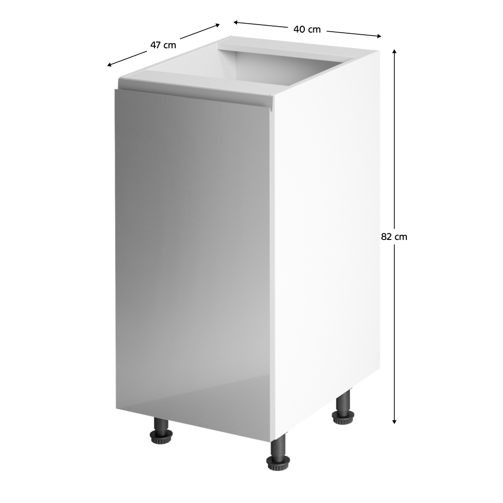 Spodná skrinka, Aurora D40Prevedenie: DTD laminová/MDFFarba: biela/sivá extra vysoký leskRozmery (ŠxHxV): 40x47x82 cmHrúbka materiálu: 15 mmSystém tichého zatvárania dvierokPracovná doska nie je súčasťou skriniek. Je možné si doobjednať pracovnú dosku v prevedení dub artisan s hrúbkou 38 mm za 56 eur/bm. Možnosť dokúpiť drez LAY ON. Spodné skrinky sú dodávané vrátane dolnej lišty, avšak presný rozmer, ktorý potrebujete, je potrebné uviesť do poznámky v objednávke. Ak rozmer neuvediete, môže sa stať, že vám sokel nebude dodaný. Ku každej dolnej skrinke, okrem D25PZ, je potrebné doobjednať 2 ks úchytok na sokel - cena 1Eur/2ks.