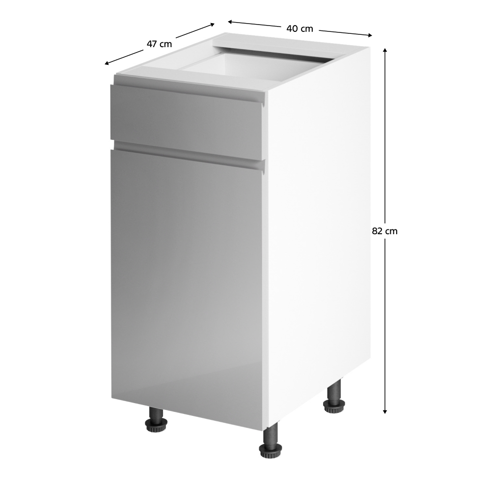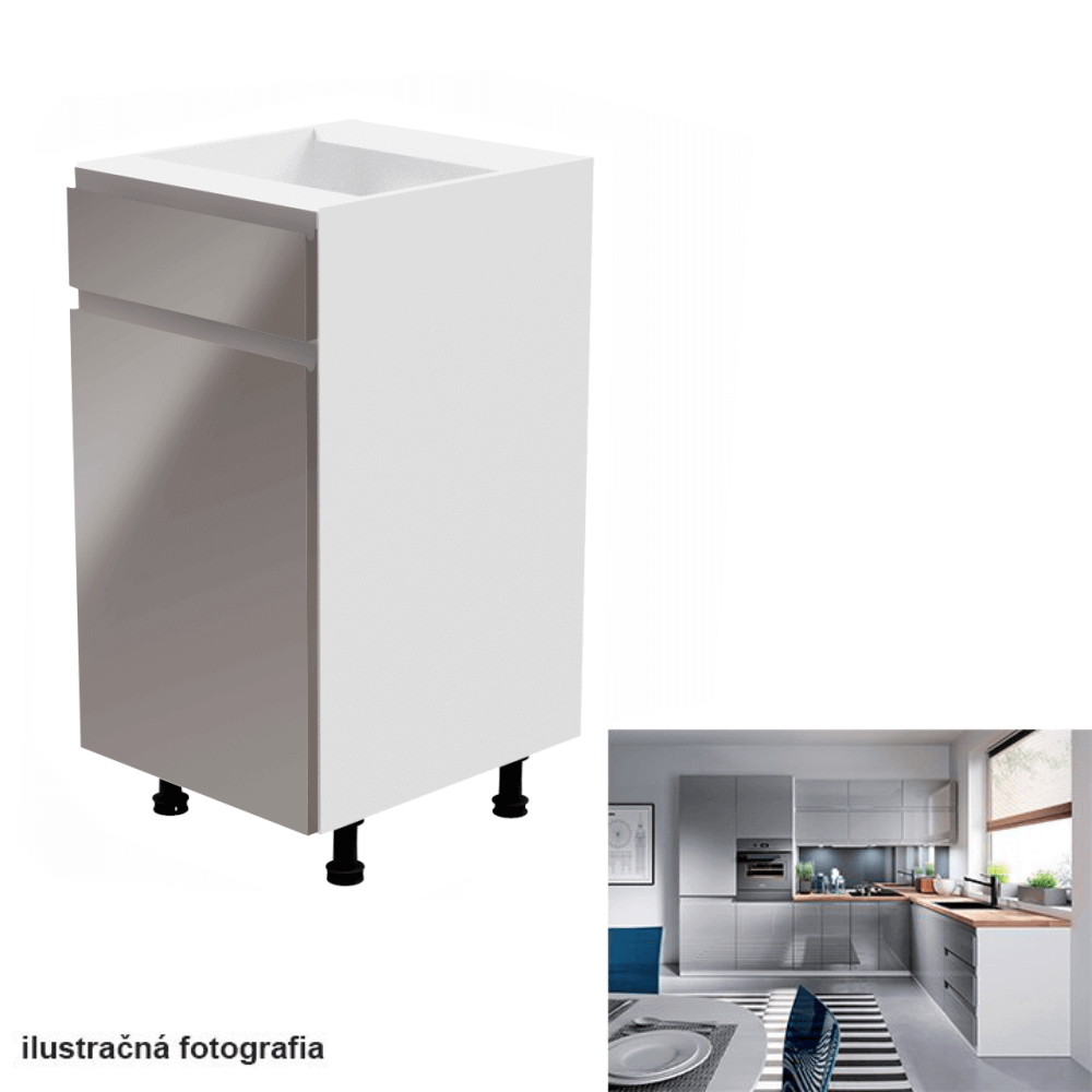 Spodná skrinka, Aurora D40S1Prevedenie: DTD laminová/MDFFarba: biela/sivá extra vysoký leskRozmery (ŠxHxV): 40x47x82 cmHrúbka materiálu: 15 mmSystém tichého zatvárania dvierokJe nutné objednať potrebný počet ukončení spodnej lištyPracovná doska nie je súčasťou skriniek. Je možné si doobjednať pracovnú dosku v prevedení dub artisan s hrúbkou 38 mm za 56 eur/bm. Možnosť dokúpiť drez LAY ON. Spodné skrinky sú dodávané vrátane dolnej lišty, avšak presný rozmer, ktorý potrebujete, je potrebné uviesť do poznámky v objednávke. Ak rozmer neuvediete, môže sa stať, že vám sokel nebude dodaný. Ku každej dolnej skrinke, okrem D25PZ, je potrebné doobjednať 2 ks úchytok na sokel - cena 1Eur/2ks.