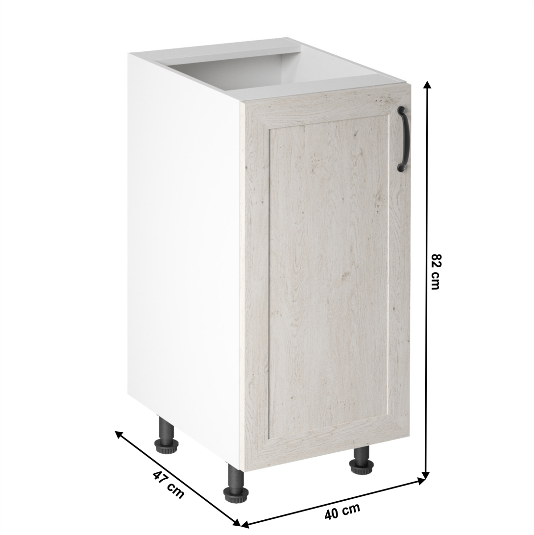 Spodná skrinka s dvierkami s policou, ľavá, ROYAL D40Materiál: korpus je vyrobený z kvalitnej laminovanej drevotrieskyFarba: biela/sosna nordickáRozmery ŠxHxV: 40x47/60x82 cm Hrúbka materiálu: 15 mmSystém tichého zatvárania dvierokDodávané v demonte.Spodné skrinky ku kuchyni ROYAL sú dodávané bez pracovnej dosky a bez sokla. Pracovnú dosku Dub Porterhouse tmavý možné doobjednať v hrúbke 3,8 cm v cene 59 Eur/1 bm. Ku každej dolnej skrinke, okrem rohových skriniek D25PZ, je potrebné doobjednať aj sokel v prevedení dub divoký v cene 10 ur/1 bm a 2 kusy úchytov na sokel v cene 1 Eur/2 ks. Objednávku vpíšte do poznámky v objednávkovom formulári.