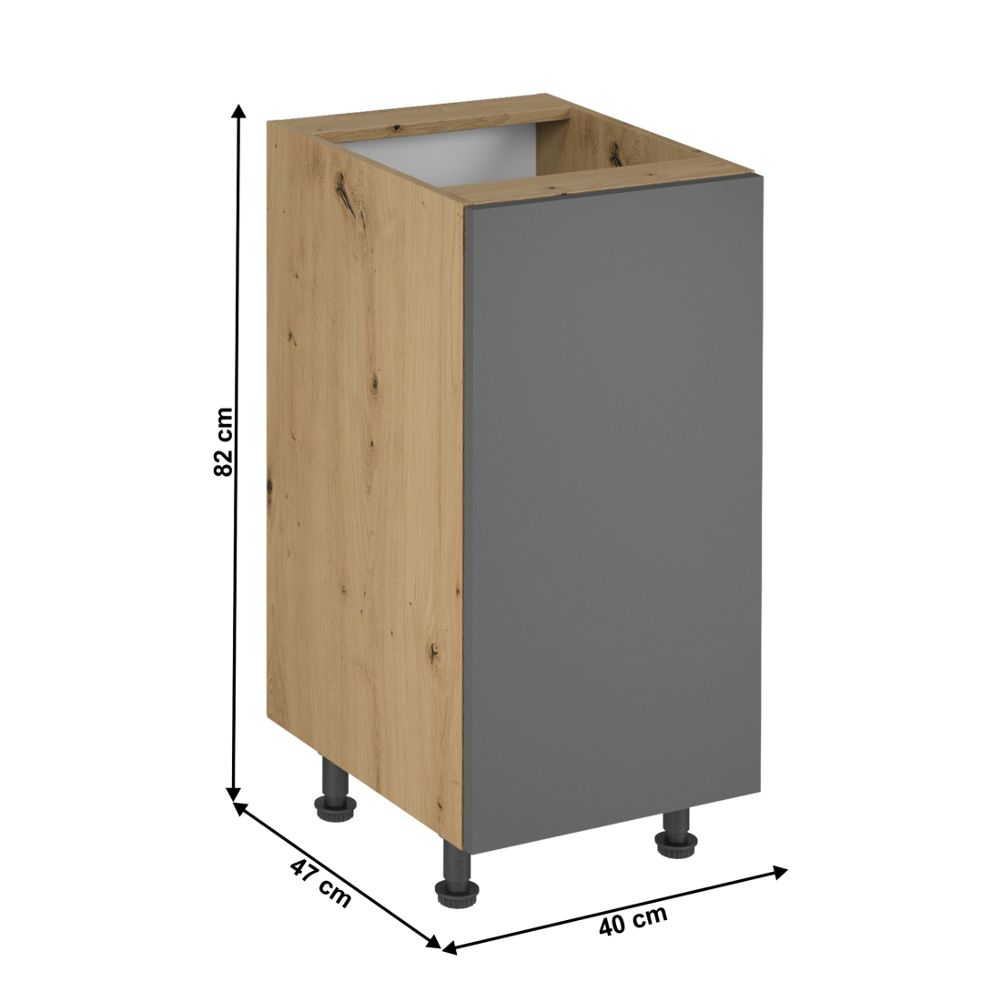 Materiál: DTD laminovanáFarba: dub artisan/sivý matRozmery (ŠxHxV): 40x47x82 cmHrúbka materiálu dvierka (dub artisan): 1,5 cmHrúbka materiálu dvierka (sivá MDF): 1,8 cmS policouUniverzálne prevedenieMožnosť voľby otvárania PUSH OPENMožnosť voľby otvárania úchytkamiFarba vnútornej strany: bielaBez pracovnej doskyBez spodnej lištyDodávané v demonte Cena sektorových skriniek je uvádzaná bez pracovnej dosky a spodnej lišty. Cena za pracovnú dosku dub artisan je 56 Eur/bm - hrúbka 38 mm, cena za pracovnú dosku čierny vulkán je 59 Eur/bm - hrúbka 38 mm. Možnosť dokúpenia spodnej lišty dub artisan v rozmere 1 m za cenu 10 Eur alebo v rozmere 2 m za cenu 17 Eur. Ku každej dolnej skrinke je potrebné doobjednať 2 ks úchytov na sokel cena 1 Eur/2 ks. Pri skrinkách D60S3 a D40S3 je potrebné si vybrať skrinku s úchytkou alebo systémom Push Open.