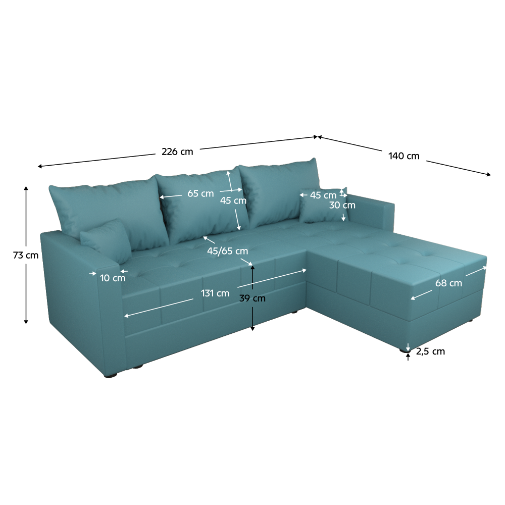 Materiál: látka Riviera 76Oderuodolnosť textílie podľa testu Martindale: 90 000 oderovFarba: petrolejováRozmery (ŠxHxV): 226x140x73 cmRozkladaciaPlocha na spanie (ŠxD): 119x199 cmVýška sedu: 39 cmHĺbka sedu: 45/65 cmŠírka sedacej časti: 131 cmŠírka otomanu: 68 cmNa nožičkáchMateriál nožičiek: plastFarba nožičiek: čiernaVýška spodného priestoru od podlahy: 2,5 cmVýplň: PUR pena T28Univerzálne prevedenieRohováS úložným priestoromDodávané s vankúšmiRozmery dekoratívnych vankúšov (ŠxV): 45x30cmRozmery opierkového vankúša (ŠxV): 65x45 cmDodávané v demonte