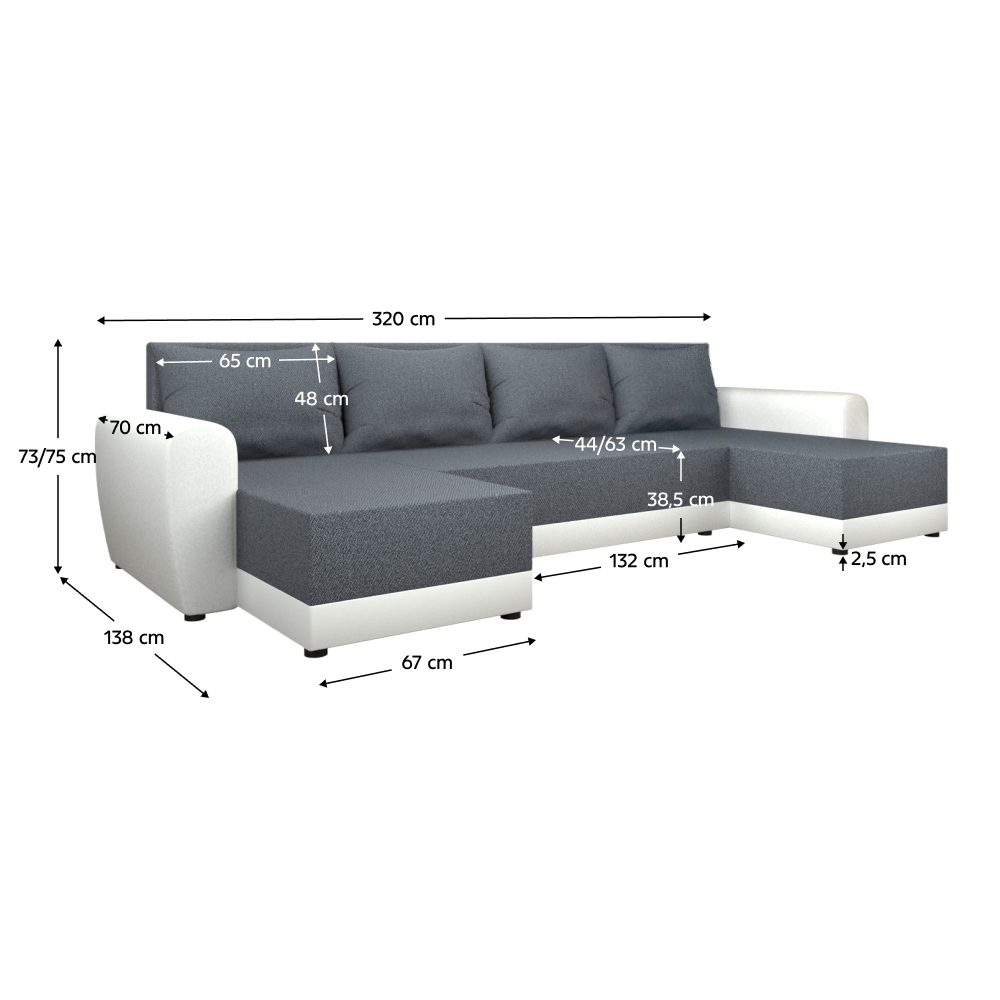 Materiál: látka Twist 20/ekokoža D511Oderuodolnosť látky podľa testu Martindale: 45 000 oderovOderuodolnosť ekokože podľa testu Martindale: 100 000 oderovFarba: sivá/bielaRozmery (ŠxHxV): 310x140/140x70/79 cmPlocha na spanie (ŠxD): 135x265 cmVýška sedu: 41 cmHĺbka sedu: 40/70 cmHĺbka otomanu bez vankúšov: 131 cmNa plastových nožičkáchFarba nožičiek: čiernaVýška spodného priestoru od podlahy: 4,5 cmVýplň: pur pena T28RozkladaciaUniverzálnaTvar US úložným priestoromDodávaná s vankúšmiRozmer vankúšov (ŠxH): 68x43 cmDodávané v demonte