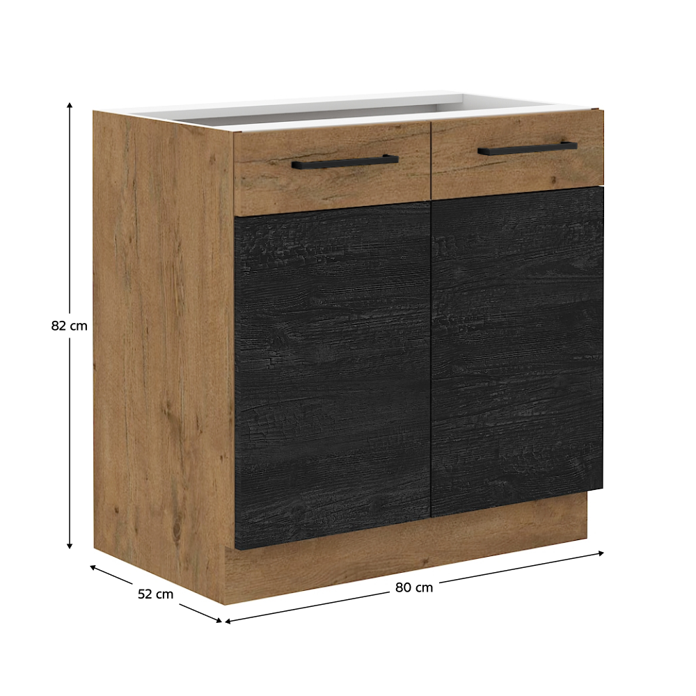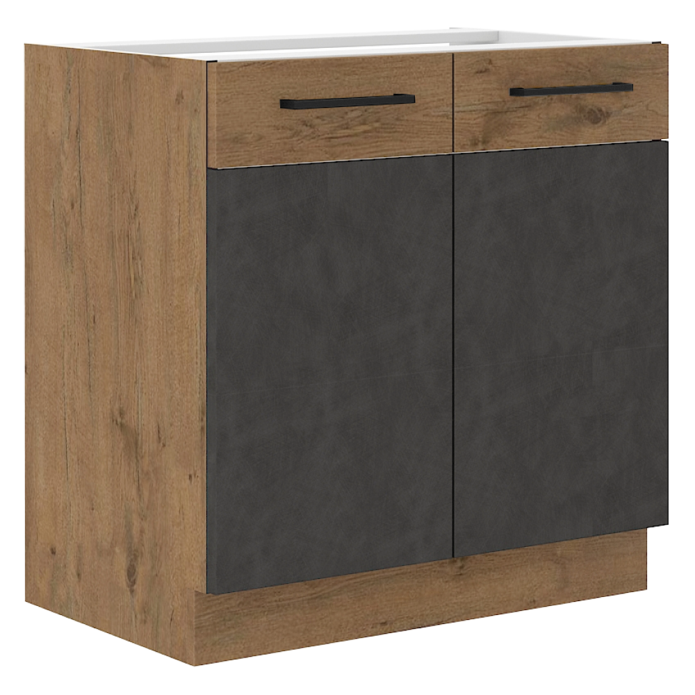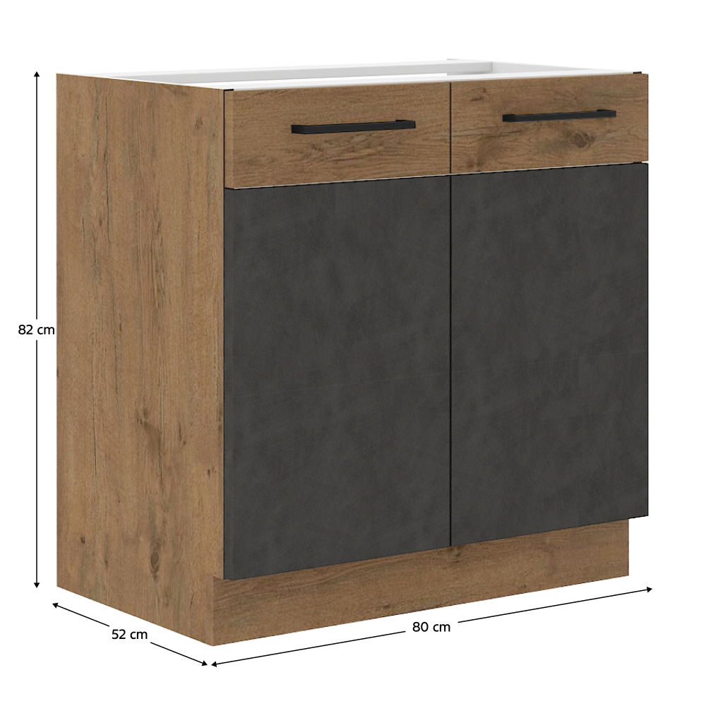 Spodná skrinka VEGA 80 D 2F BBMateriál: DTD laminovanáFarba: sivá matná/dub lancelotRozmery (ŠxHxV): 80x52x82 cmSkrinka bez pracovnej doskySystém tichého zatvárania dvierokVrátane spodnej lištyDodávané v demonteSpodné skrinky sú dodávané vrátane dolnej lišty, bez pracovnej dosky.Možnosť dokúpenia pracovnej dosky dub lancelot v cene 55 Eur/bm. Možnosť dokúpiť univerzálny drez LAY ON.