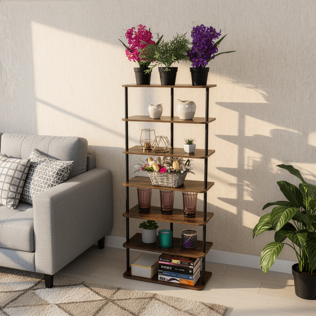 Materiál: kov/DTDFarba: čierna/rustikálne drevoRozmery (ŠxHxV): 46x24x102,5 cmHrúbka tyče: 1,6 cmNosnosť na policu: 5 kg-10 kgVýška police: 16 cm6-radovýViacúčelovýDodávané v demonte