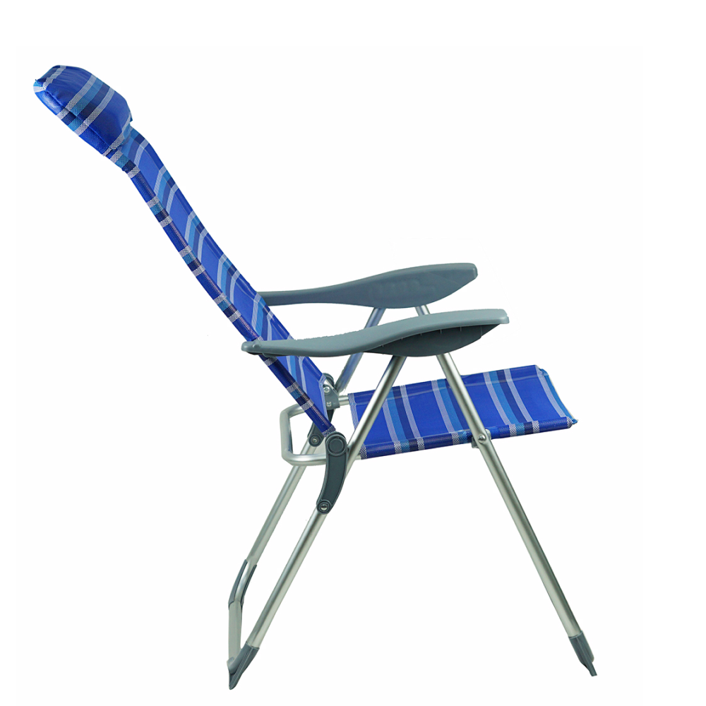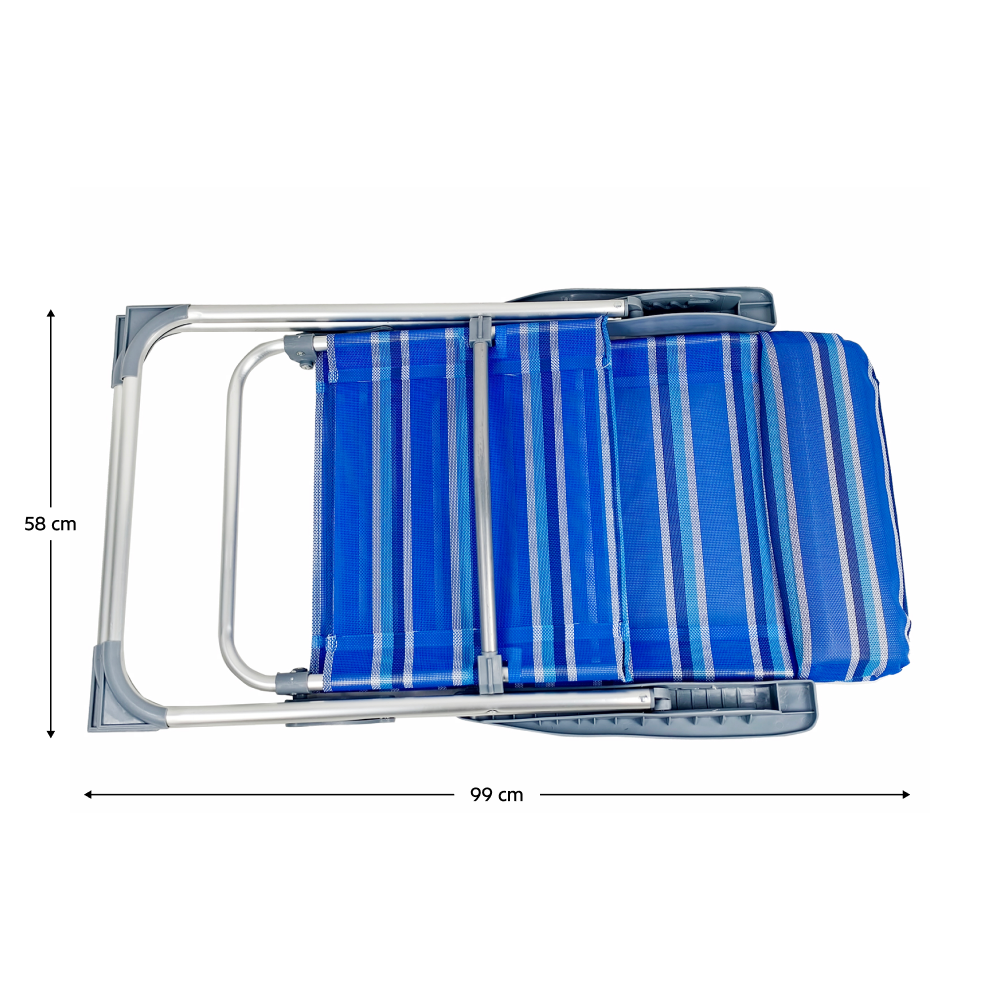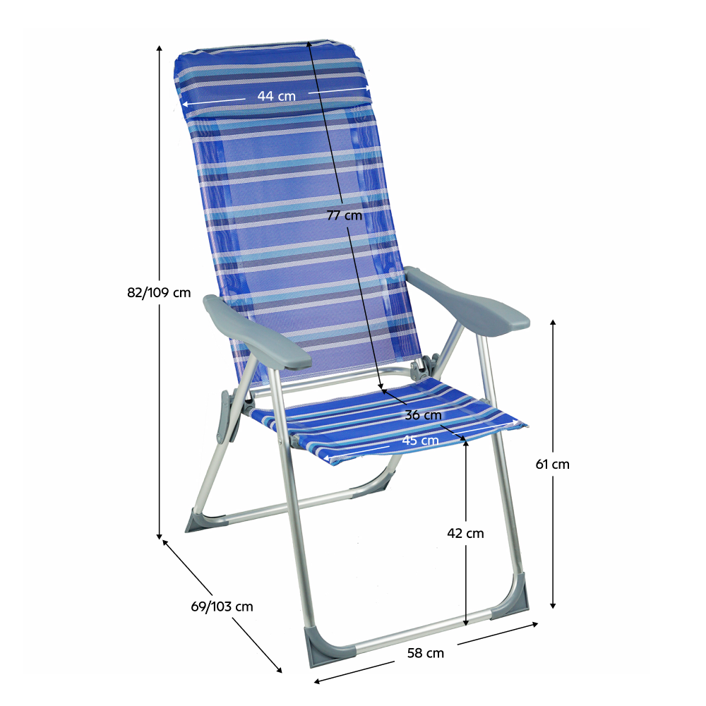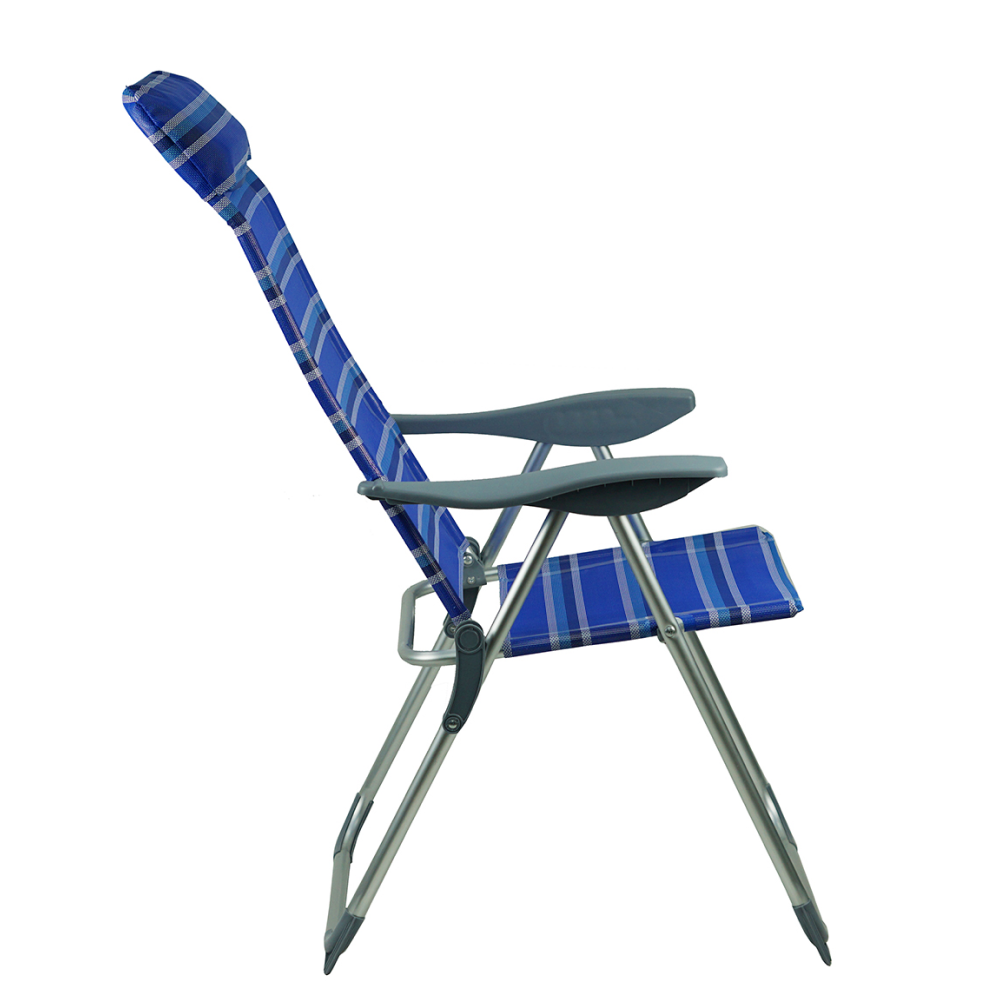 Materiál: hliník/plast/polyesterFarba: modrá/siváRozmery (ŠxHxV): 58x69/103x82/109 cmRozmery zložené kreslo (ŠxHxV): 99x58x8 cmVýška sedu: 42 cmHĺbka sedu: 36 cmŠírka sedu: 45 cmŠírka opierky chrbta: 44 cmVýška opierky chrbta: 77 cmVýška opierky na ruku: 61 cmNosnosť: 90 kgHmotnosť: 3,75 kgPolohovacie5 polôhPlastové područkyPlastové krytky na spodnej konštrukciiVhodné na záhradu, terasu, k bazénuJednoduchá manipulácia a presunDodávané v monte