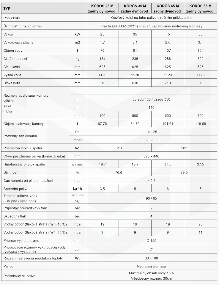 KÖRÖS M je dostupný v štyroch výkonnostných variantoch (KÖRÖS 25 M, KÖRÖS 35 M, KÖRÖS 45 M a KÖRÖS 55 M) a má dve možnosti pripojenia dymovodu (horné pripojenie a zadné pripojenie).