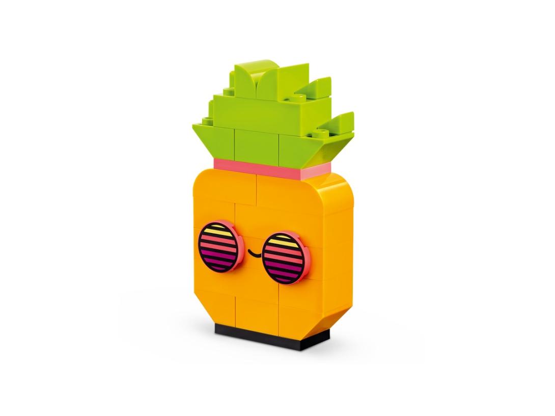 Táto univerzálna stavebnica obsahuje 333 kociek rôznych veľkostí a žiarivých neónových farieb. 18 kociek obsahuje aj výrazné oči, ktoré detským výtvorom vdýchnu život. Súčasťou je tlačený návod napostavenie 5 zábavných modelov – ananásu, zvýrazňovača, auta, mimozemšťana a kolieskových korčúľ –, ktoré deťom dodajú tvorivé sebavedomie potrebné na postavenie všetkého, čo len chcú! V appke LEGO Builder navyše nájdete digitálnu verziu návodu na stavanie.