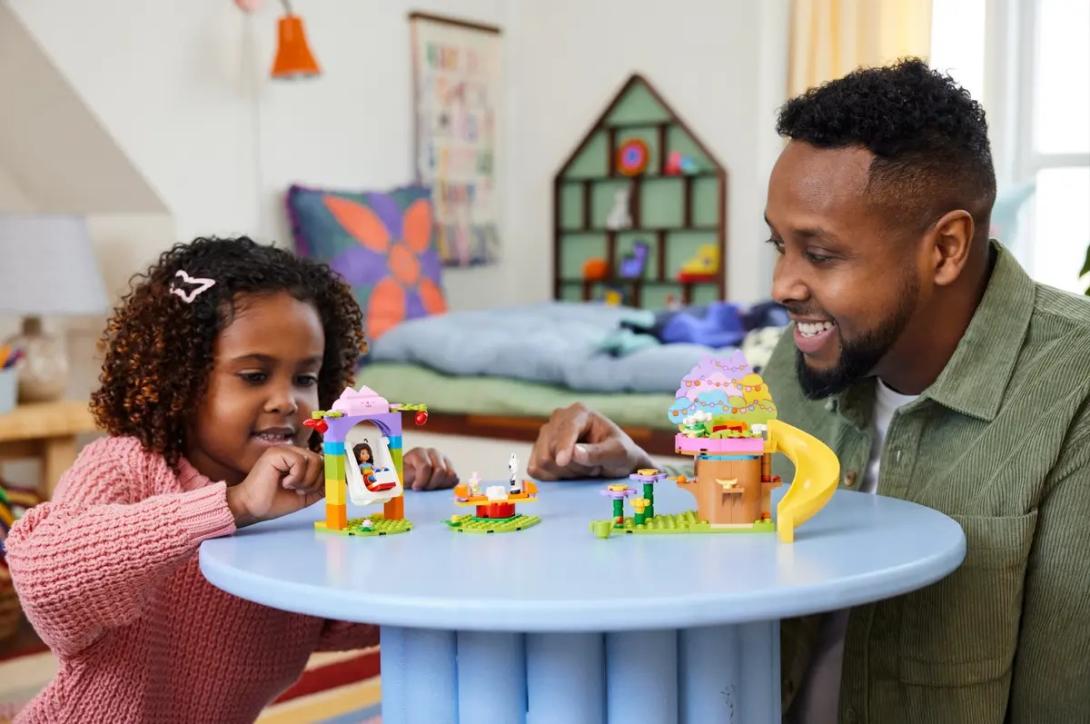 Gabi, Pandy Ťapka a Víla mačička z obľúbeného televízneho seriálu pijú čaj v domčeku na strome, kde má Víla mačička posteľ a jahodové občerstvenie. Malí záhradníci tu môžu pestovať kvety a ich kamaráti sa môžu prísť hrať na šmýkačke, hojdačke a kolotoči. Príslušenstvo vrátane jabĺčok, kanvy, čajníka, šálok a motýľov inšpiruje deti k nápaditým hrám na postavy. K dispozícii je aj farebný obrázkový návod a aplikácia LEGO Builder zasa obsahuje digitálne intuitívne nástroje na zväčšovanie a otáčanie modelov. Rovnako ako pri všetkých stavebniciach zo série LEGO 4+ je súčasťou balenia aj veľká štartovacia kocka, s ktorou sa deti môžu pustiť rovno do zábavného stavania.