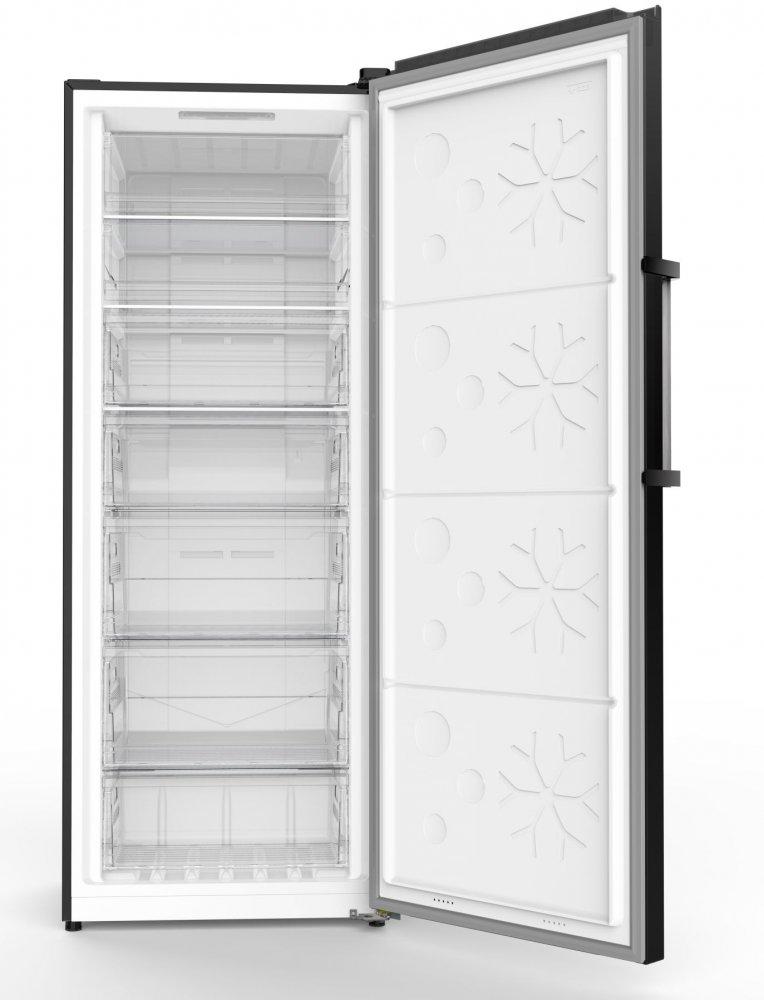Priestor mrazničky je členený na päť zásuviek a dve police, ktoré sú vpredu uzavreté výklopmi. Tým, že sa jedná o mrazničku, ktorej rozmeny sú 158,5 x 71 x 77 cm, sú zásuvky a police skutočne veľké. Nie je teda vôbec žiadny problém tu umiestniť aj objemné potraviny.