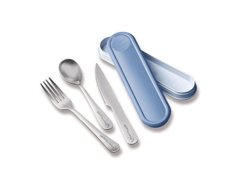 Príbor z nerezovej ocele v plastovom puzdre, obsahuje menšie lyžicu, nôž a vidličku, Možno umývať v umývačke.