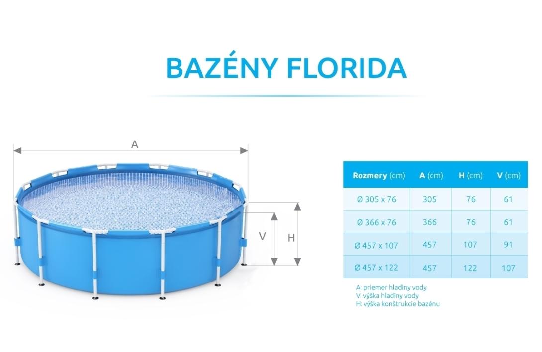 Bazén Florida patrí medzi obľúbené nadzemné bazény v Slovenskej republike. Kúpanie vo vlastnom bazéne si môže dopriať naozaj každý. Prednosťou bazéna Florida je výhodná cena, ľahká údržba, stabilita konštrukcie, široká hladina vody a ľahké sprevádzkovanie. Stačí len pripraviť miesto pre bazén, rozvinúť bazénovú podložku, bazén rozbaliť, zostaviť podpornú konštrukciu, na ktorú sa navlečie bazénová fólia. Od vybalenia bazéna môžete do 30 minút napúšťať vodu.