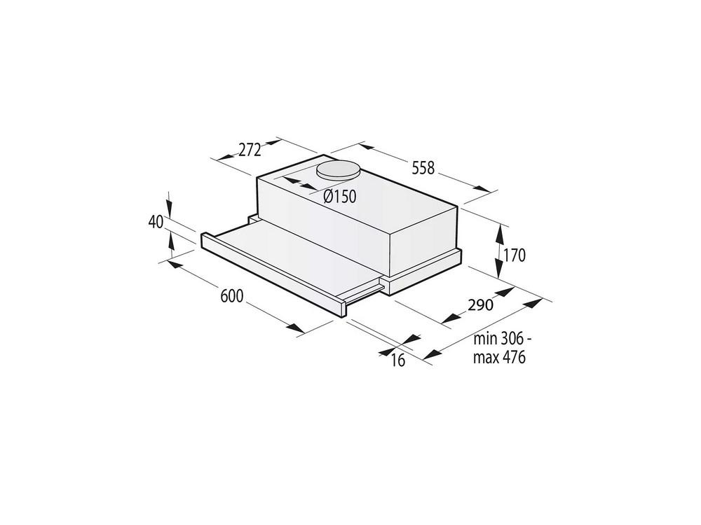 Digestor, Rozmery odsávacieho ventilátora MORA majú 17 × 60 × 30,6 cm (v × š × h)
