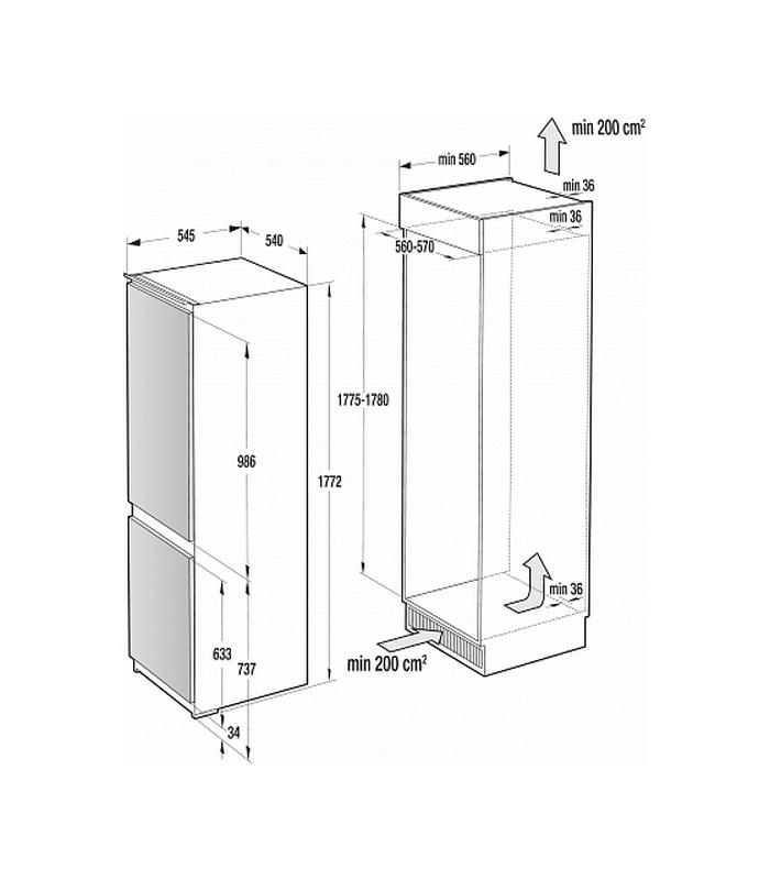 Vstavaná chladnička, Šírka 540 mm, Výška 1772 mm, Hĺbka 545 mm, Hmotnosť 61 kg, Elektrické napätie 230 V, Celkový objem 260 l, Objem chladničky 189 l, Objem mrazničky 71 l