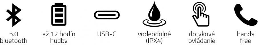 Bluetooth slúchadlá, Bluetooth 5.0 + EDR, Vodoodolné so stupňom krytia IPX4, Nabíjanie s USB-C, Hands-free telefónne hovory