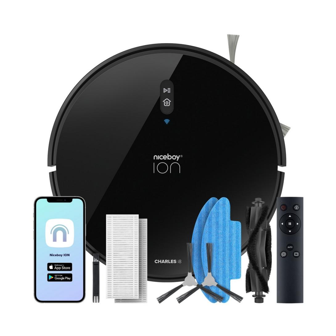 Robotický vysávač Niceboy ION Charles i8 v sebe kombinuje nielen účinný vysávač, ale zároveň aj mop s inteligentným dávkovaním vody AQUA Direct. S mobilnou aplikáciou Niceboy ION vybavíte upratovanie v priebehu sekundy zo svojho mobilného telefónu. Vysávač využíva inteligentnú technológiu Optical Flow na rozpoznanie znečistenia, navigačný systém NaviGATE na stopercentné pokrytie upratovanej plochy a s technológiou Red SENSE sa vyhne kolíziám a pádom. Kapacita batérie vydrží na 120 minút upratovania a robot sa sám príde dobiť do nabíjacej stanice.