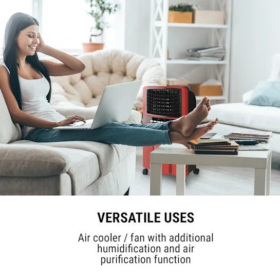 Jeho základnou funkciou je inteligentná kombinácia ventilátora a klimatizácie, ktorá prináša do miestnosti prúd studeného vzduchu. Chladenie fúkaného vzduchu sa dosahuje odparovaním vody/ľadu z 6-litrového zásobníka vody. Okrem chladenia vzduchu sa zariadenie Klarstein Baltic Red odlišuje od tradičných ventilátorov tým, že vzduch zvlhčuje a čistí pre zlepšenie klímy v miestnosti.