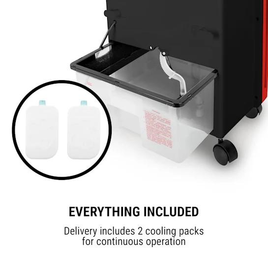 V prevádzke zariadenie vyžaduje málo pozornosti, pretože hodinová spotreba vody je s hodnotou 1 litra taká nízka, že vodu stačí v prípade bežného kancelárskeho dňa dopĺňať len raz denne. Dva dodávané chladiace akumulátory striedavo podporujú chladenie vzduchu. Dodávané diaľkové ovládanie umožňuje kompletné ovládanie z ľahu alebo sedu bez toho, aby ste museli ísť k zariadeniu; perfektný pôžitok z chladného vánku.