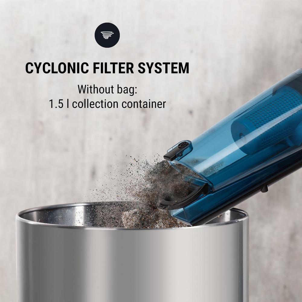 Cyklónový filtračný systém je mimoriadne účinný a nevyžaduje vôbec vrecko: nádoba na nečistoty s kapacitou 1,5 litra sa dá po použití od vysávača ľahko oddeliť a vyprázdniť. V nádobe na prach sa okrem toho nachádza aj hygienický filter HEPA, ktorý je možné v prípade potreby jednoducho odobrať a vyčistiť. Okrem mnohých funkcií vysávač navyše zapôsobí svojou nízkou hmotnosťou: s váhou 1,5 kg (ručné zariadenie) alebo 1,9 kg (podlahové zariadenie) je veľmi ľahký a spoľahlivo čistí s výkonom 600 W.