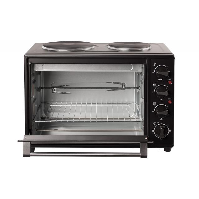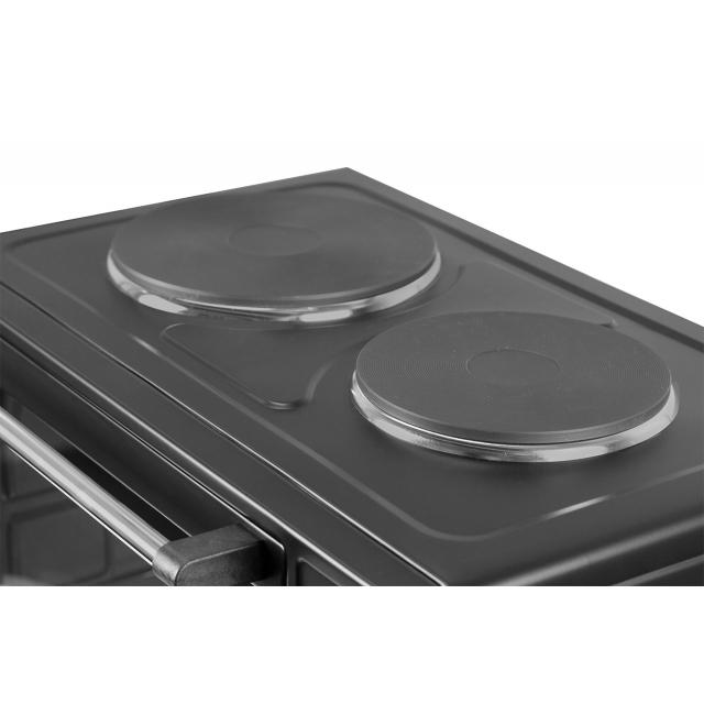 Umožní vám na malom priestore variť, piecť, zapekať či grilovať, pričom naraz môžete používať aj rúru, aj variče. A hoci má tento výkonný „kuchár“ trpasličie rozmery, dokážete na ňom uvariť obrie porcie – vnútorný objem rúry je 34 l a liatinové platne majú priemer 15,5 a 18,5 cm, takže sa vám na ne poľahky zmestia stredne veľké hrnce s riadnymi porciami polievky aj druhého jedla.