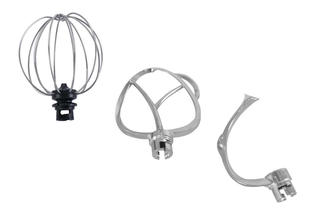 - Odolné nástavce pre šľahanie, miešanie a hnetenie v nerezovej mise