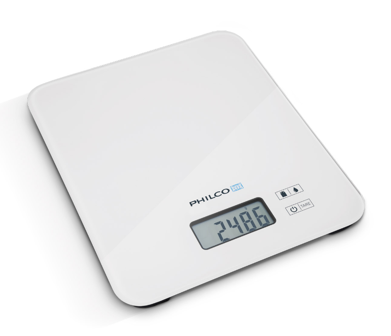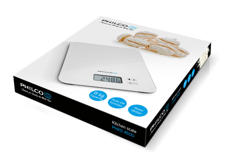 - Digitálna kuchynská váha PHKS4500 v čistom minimalistickom dizajne s prehľadným modro podsvieteným displejom.