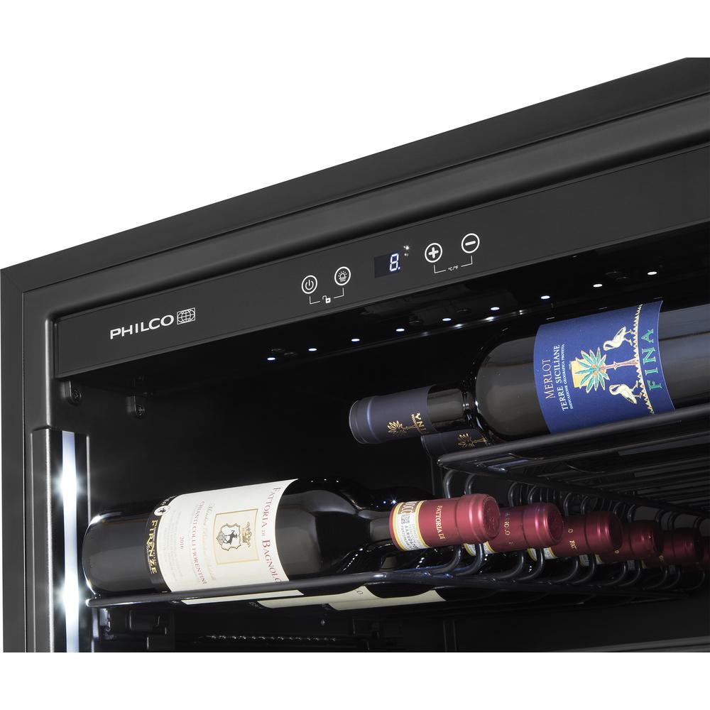 Jednozónová, kompresorová, senzorovo ovládaná vínotéka Philco PW40LV na 40 fliaš, v energetickej triede A s Label View usporiadaním, vďaka ktorému vidíte kde, ktoré víno máte uložené a to bez otvorenia dverí. Vínotéka je vybavená UV filtrom na skle dverí, kompresorom špeciálne uloženým pre zníženie vibrácií, kúrením pre vyrovnávanie kolísania okolitých teplôt a displejom.