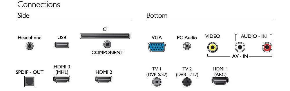 - Iné pripojenia: Anténa IEC75, Konektor satelitu, Common Interface Plus (CI+), Digitálny zvukový výstup (optický), PC-vstup VGA, Počítačový zvukový vstup (3,5 mm), Zvukový vstup Ľ/P, Slúchadlový výstup