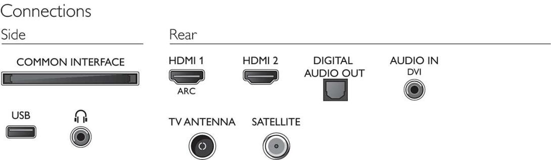 - Iné pripojenia: Common Interface Plus (CI+), Digitálny zvukový výstup (optický), Anténa IEC75, Konektor satelitu, Zvukový vstup (DVI), Slúchadlový výstup