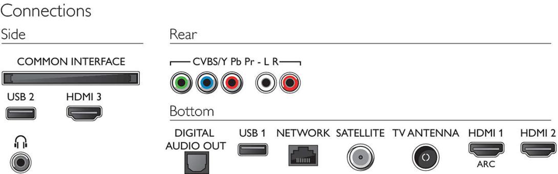 - Iné pripojenia: Konektor satelitu, Ethernet-LAN RJ-45, Common Interface Plus (CI+), Digitálny zvukový výstup (optický), Zvukový vstup Ľ/P, Slúchadlový výstup