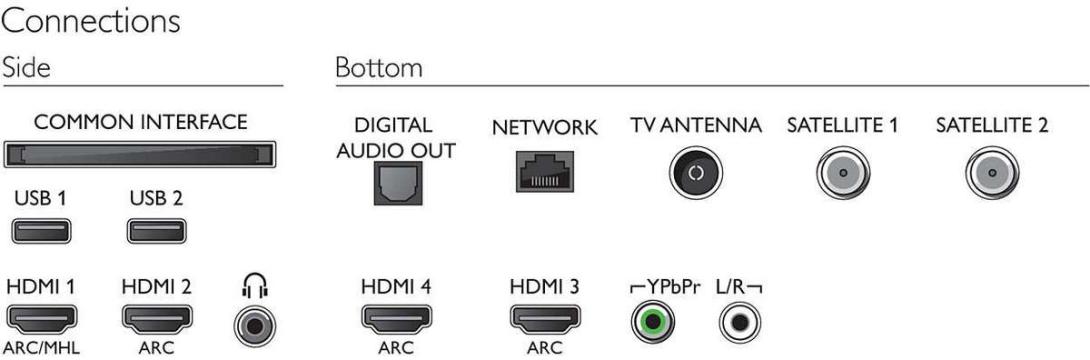 - Iné pripojenia: Anténa IEC75, Common Interface Plus (CI+), Digitálny zvukový výstup (optický), Ethernet-LAN RJ-45, Zvukový vstup Ľ/P, Slúchadlový výstup, 2x vstup pre satelit