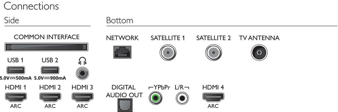 - Iné pripojenia: Common Interface Plus (CI+), Digitálny zvukový výstup (optický), Ethernet-LAN RJ-45, Zvukový vstup Ľ/P, Slúchadlový výstup, Konektor satelitu