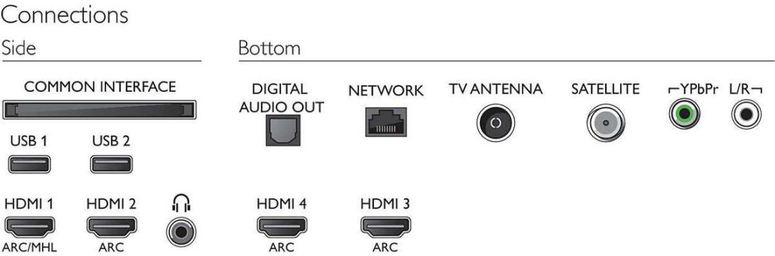 - Iné pripojenia: Common Interface Plus (CI+), Digitálny zvukový výstup (optický), Anténa IEC75, Konektor satelitu, Ethernet-LAN RJ-45, Zvukový vstup Ľ/P, Slúchadlový výstup