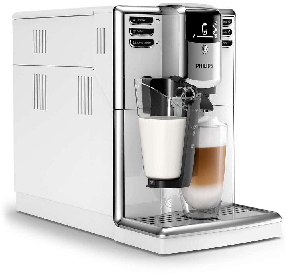 Jednoducho pripravíte lahodné kávové variácie ako espresso, kávu, kapučíno a latte macchiato jednoduchým stlačením tlačidla. Vďaka peniču mlieka LatteGo napeníte mliečne variácie hodvábne jemnou penou, a navyše ho dokážete jednoducho zostaviť a vyčistiť za menej ako 15 sekúnd*.