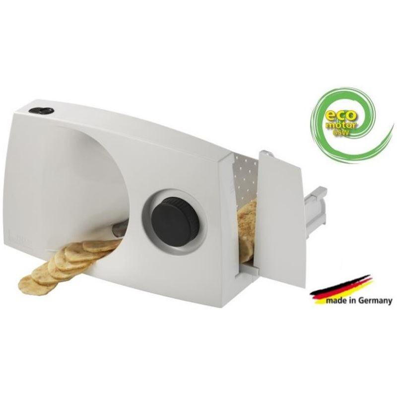 Krájač potravín, Vysokokvalitný plast, Zúbkovaný nôž s priemerom 17 cm, Hrúbka rezu nastaviteľná do cca 14 mm, Bezpečnostný spínač na prerušovanú a nepretržitú prevádzku