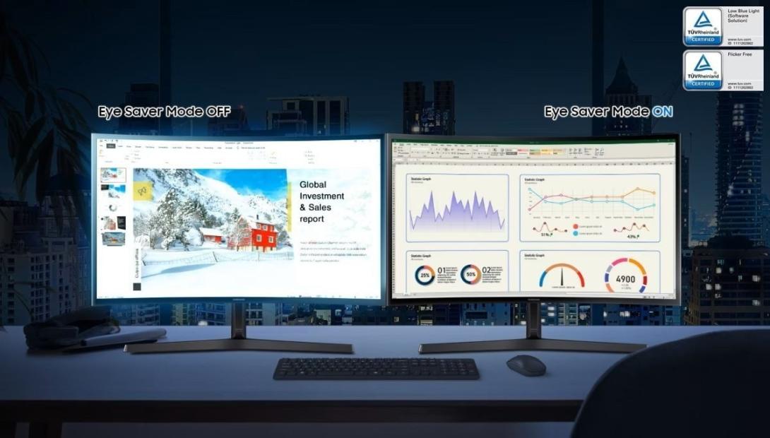 Monitor je vybavený režimom Eye Saver Mode, ktorý redukuje vyžarovanie modrého svetla. Na určitej vlnovej dĺžke modré svetlo nadmerne stimulujú sietnicu ľudského oka čím poškodzuje zrak. Tento režim tak spolu s technológiou Flicker Free, ktorá eliminuje blikanie monitora chráni oči pred únavou. Užite si tak hranie, alebo sledovanie filmov dlhšie a pohodlnejšie.