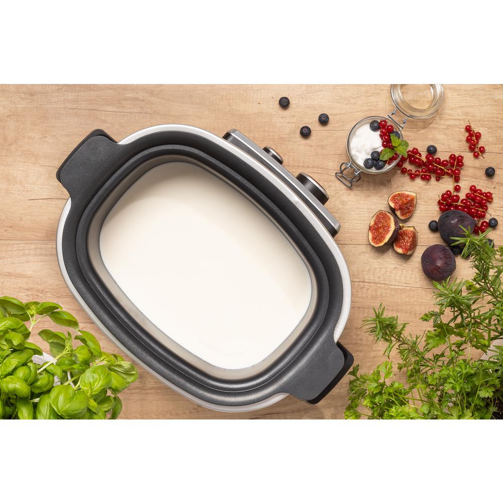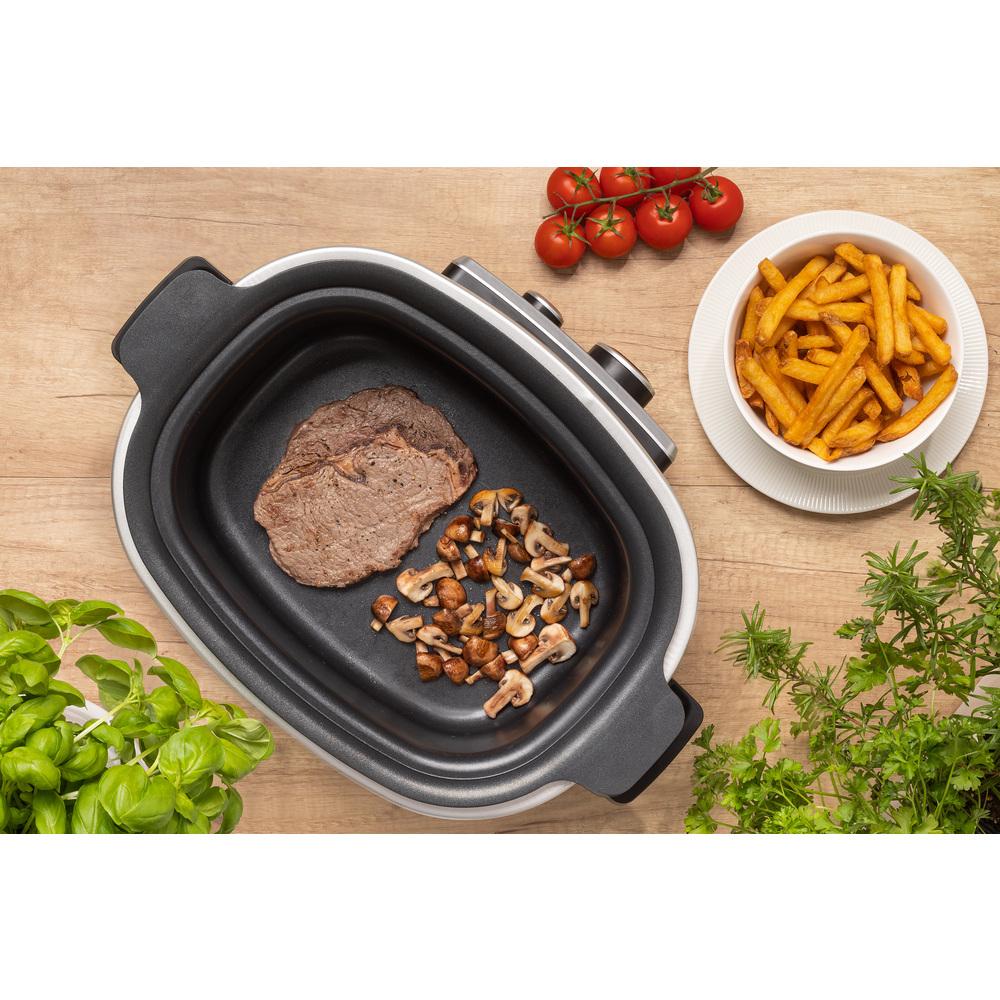 Multifunkčný a Pomalý hrniec, objem 5,5 l pohodlne postačí celej rodine, vrstva s technológiou zabraňujúcou prichytávaniu pokrmov neobsahujúcou PFOA, stena nádoby z hliníkovej zliatiny s hrúbkou 3 mm, môže sa uložiť do chladničky