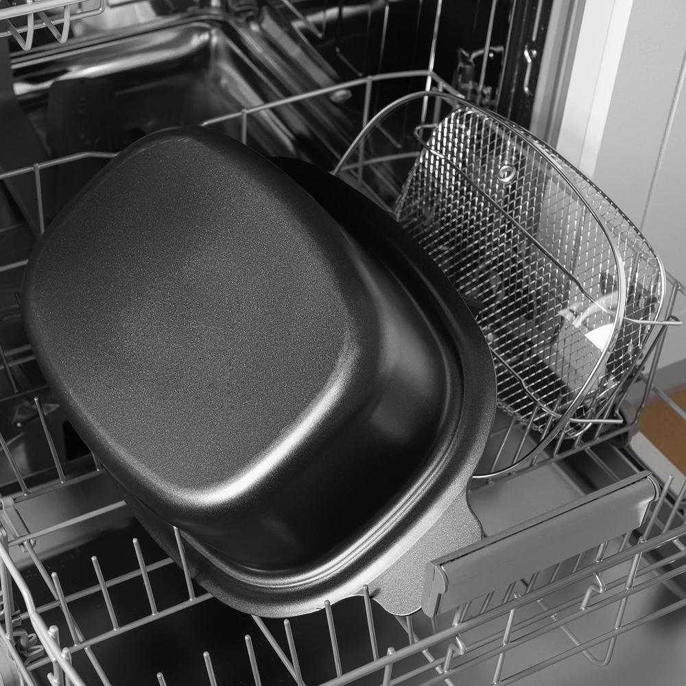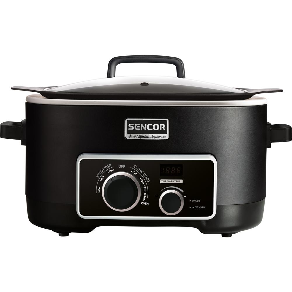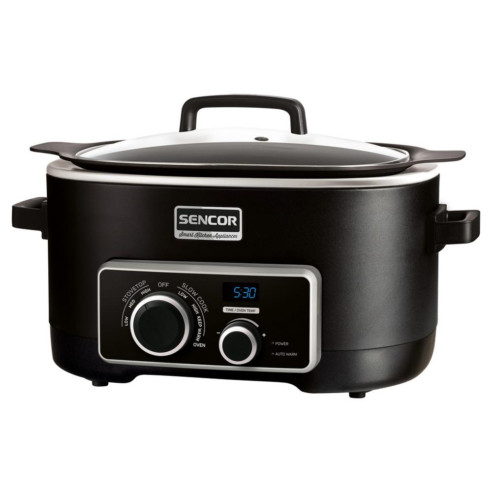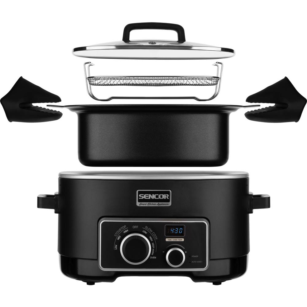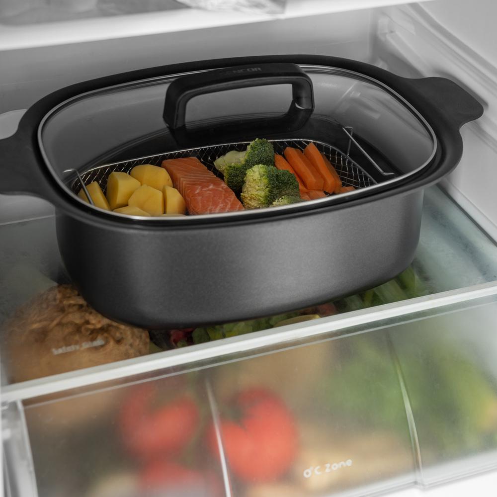 Multifunkčný a Pomalý hrniec, objem 5,5 l pohodlne postačí celej rodine, vrstva s technológiou zabraňujúcou prichytávaniu pokrmov neobsahujúcou PFOA, stena nádoby z hliníkovej zliatiny s hrúbkou 3 mm, môže sa uložiť do chladničky