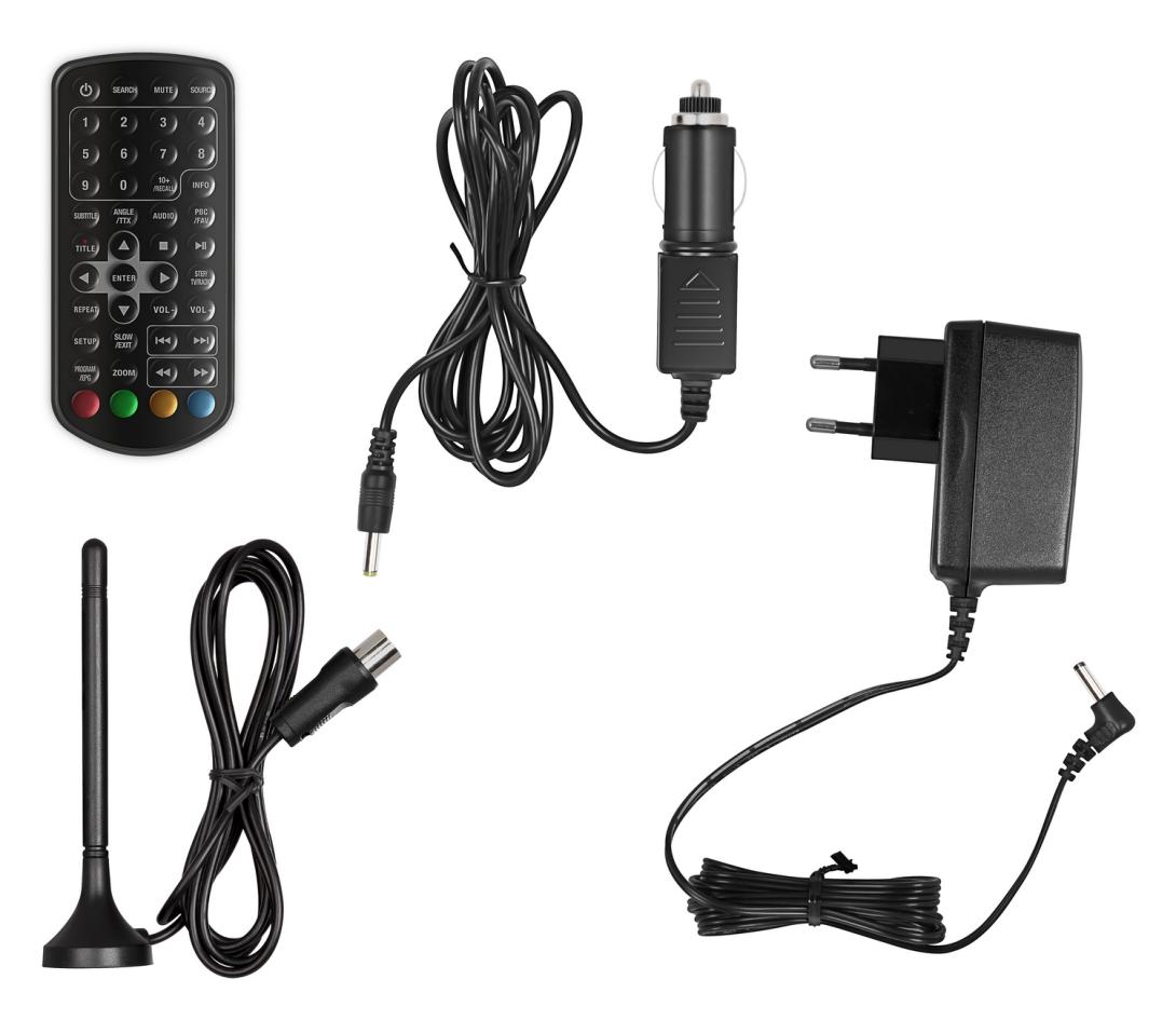 Prenosný dvd prehrávač, Vstavaná batéria Li-Ion s kapacitou 1 000 mAh, Príslušenstvo: Anténa, nabíjačka do auta, napájací adaptér, diaľkový ovládač, batéria, návod na obsluhu, Napájanie: 9 V/1,5 A DC, Rozmery hlavného prístroja: 275 × 108 × 235 mm, Hmotnosť: 1,37 kg
