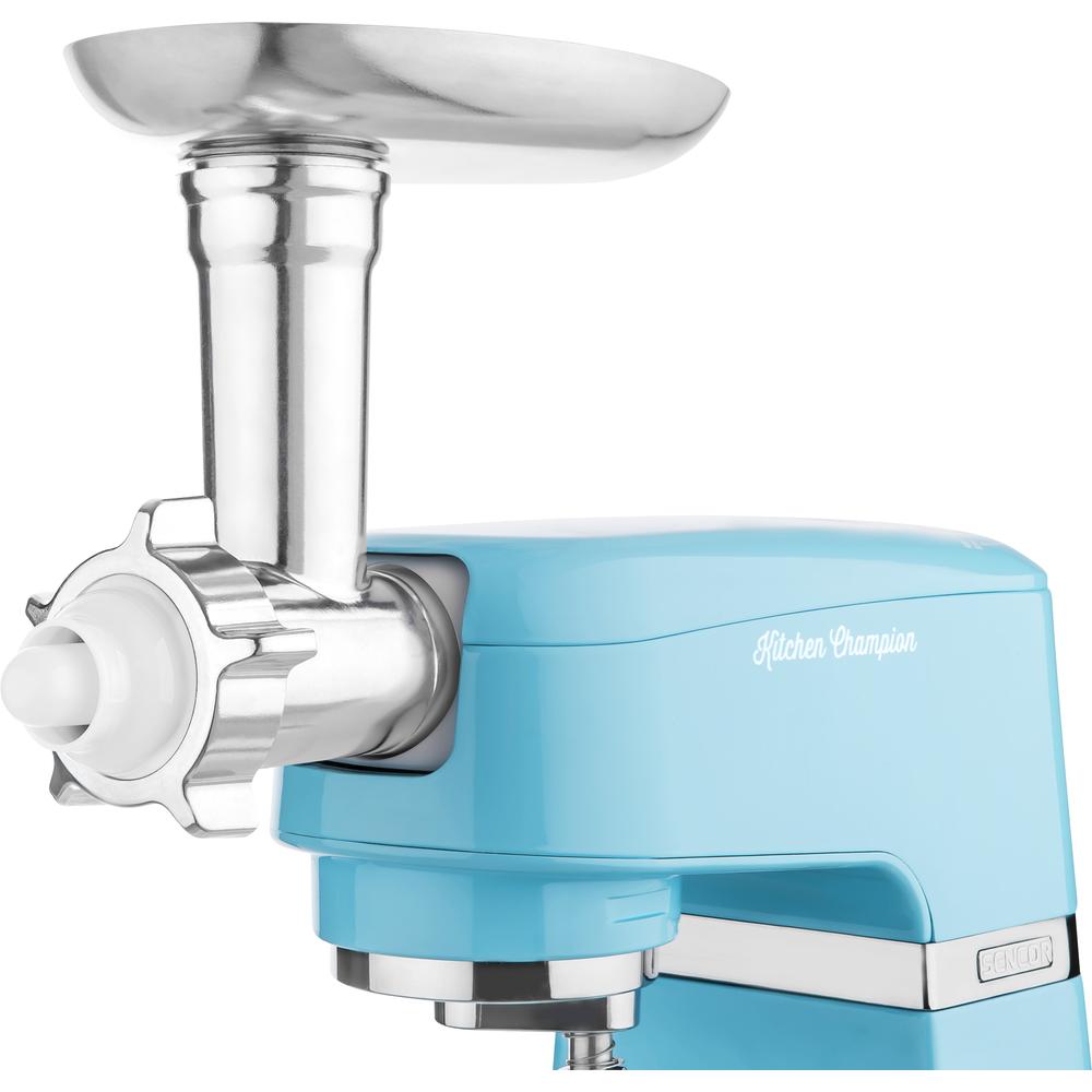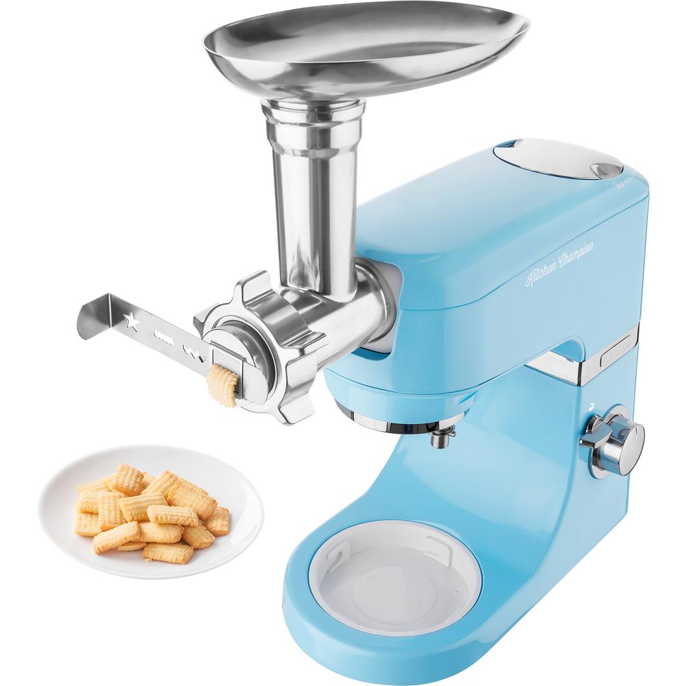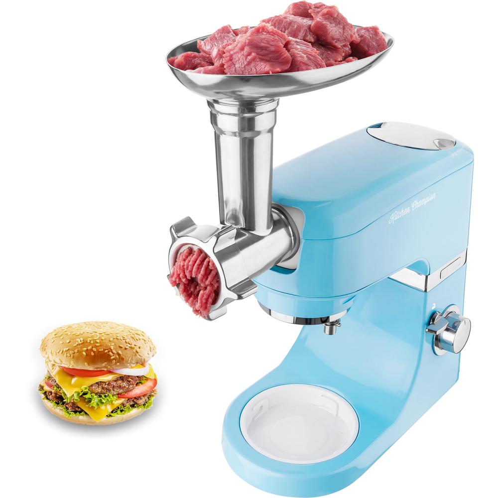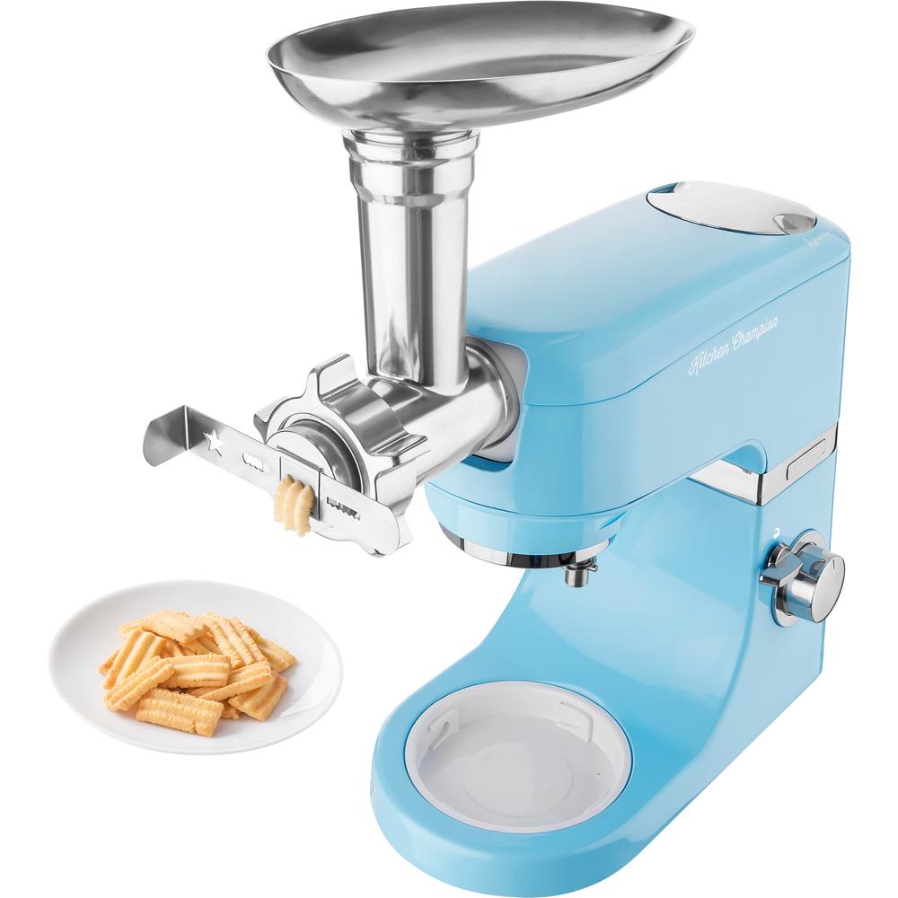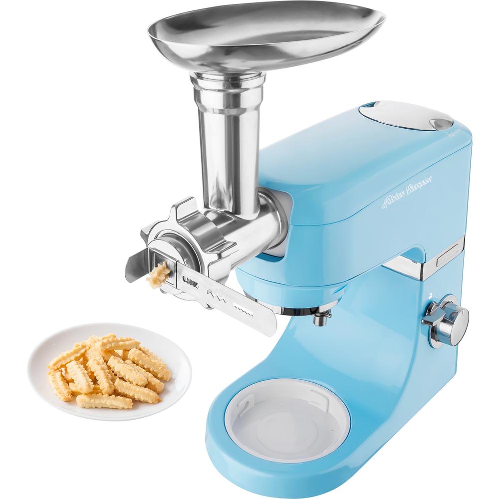 Kuchynský robot, extrémne výkonný 1 000W motor s 6-ročnou zárukou, pevné celokovové telo s kovovými prevodmi, 3-výstupová konštrukcia, 4,5 l antikorová nádoba , 1,5 l sklenený mixér, mlynček na mäso na hrubé a jemné mletie, 3 nadstavce na hnetenie