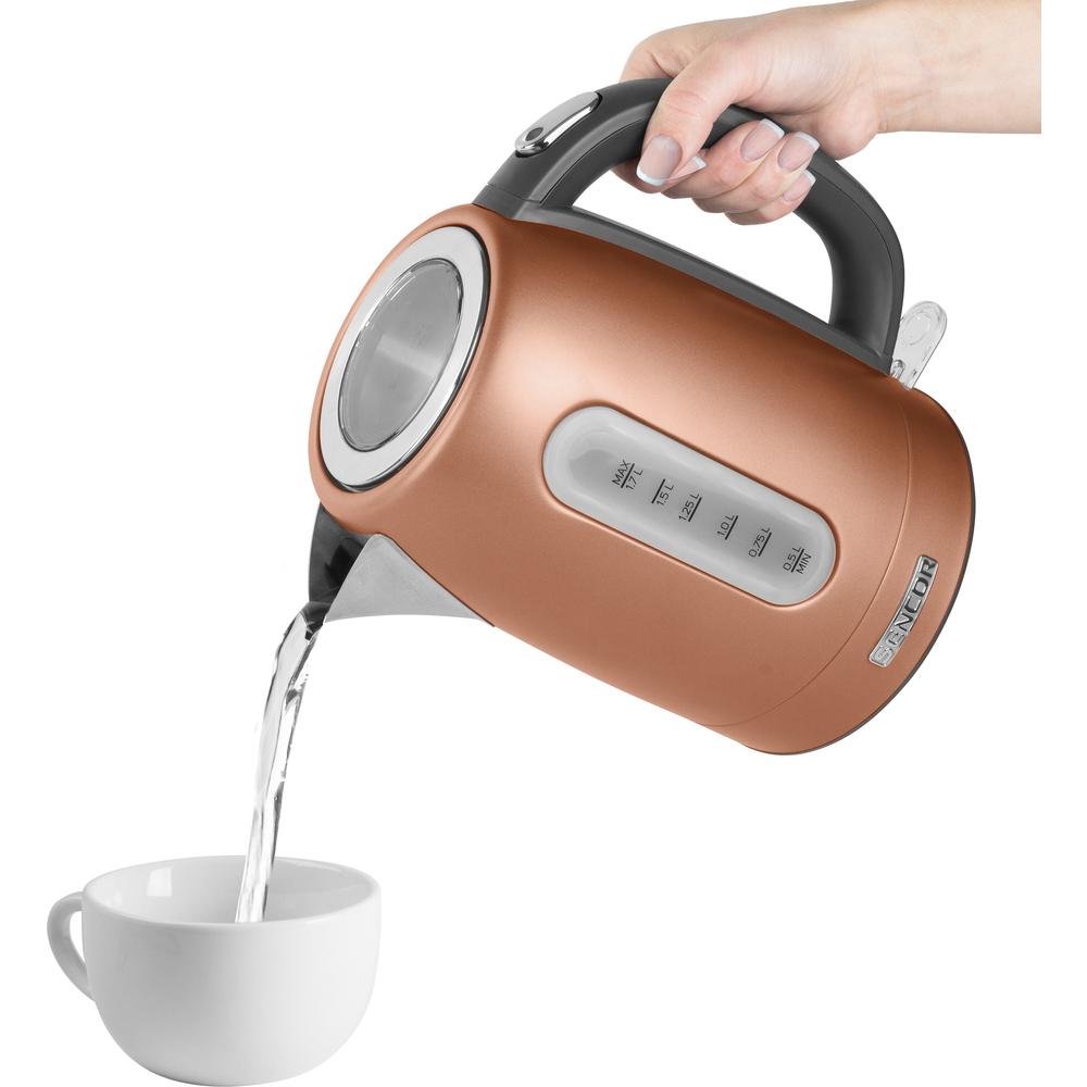 Rýchlovarná kanvica, Objem 1,7 l, Ukazovateľ hladiny vody, Vyberateľný a umývateľný filter na zachytenie nečistôt a usadenín, Príkon 2 150 W, Hmotnosť bez podstavca: 725 g, Napätie a frekvencia: 220 – 240 V, 50 Hz