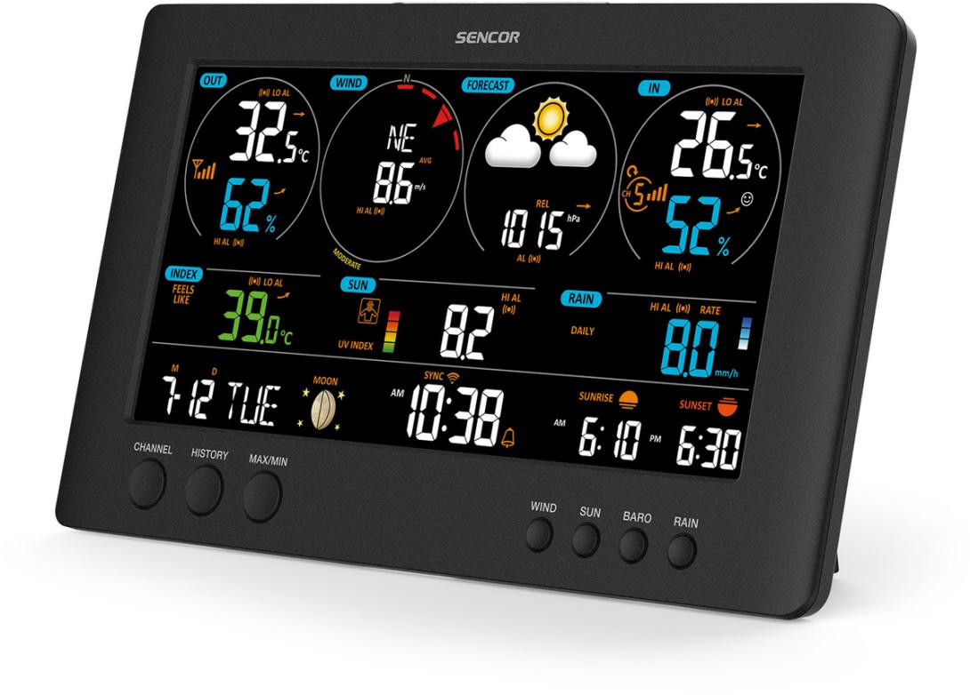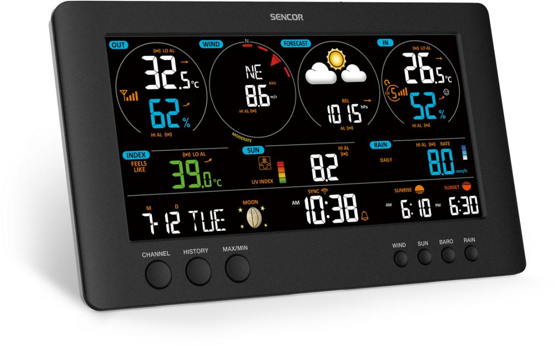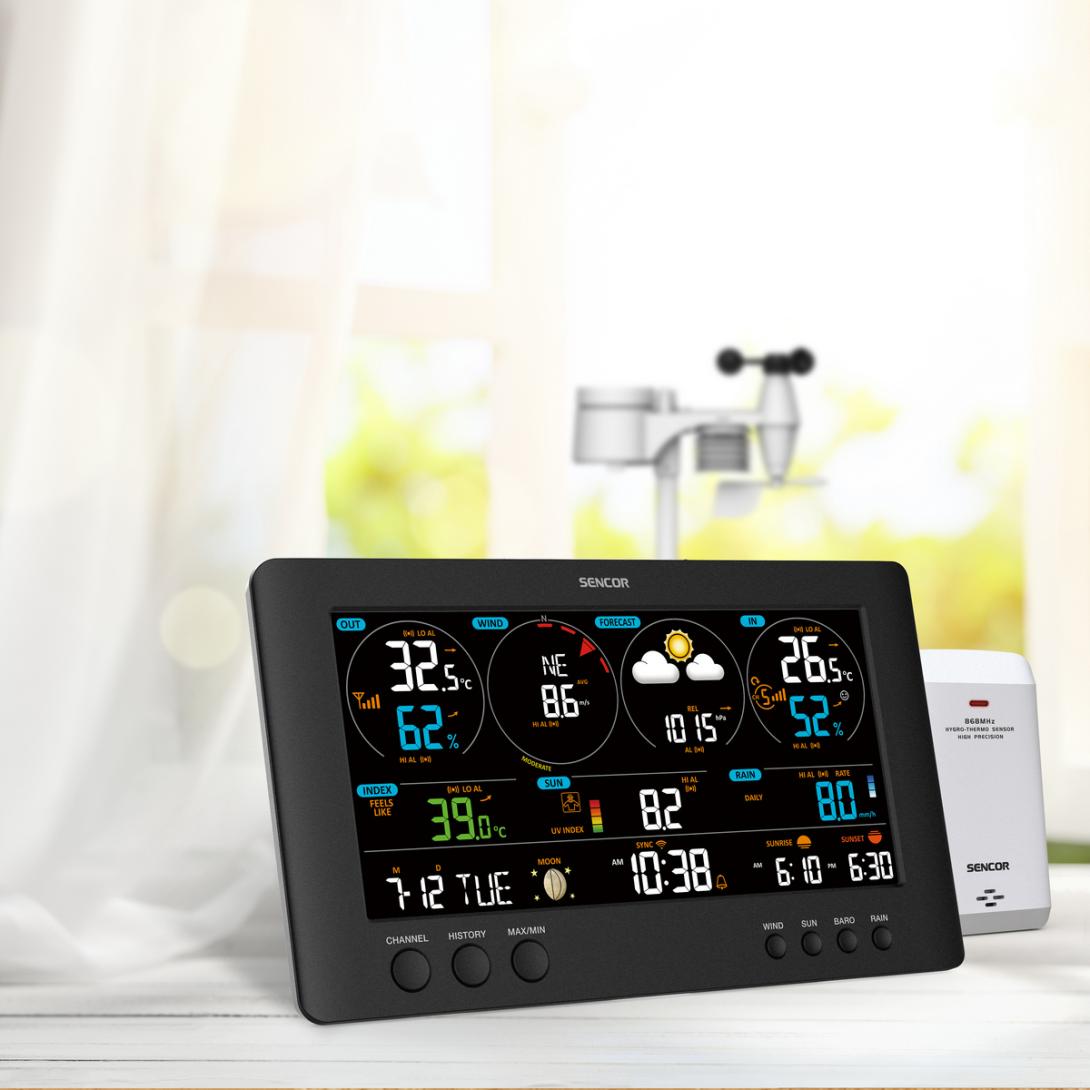 - Bezdrôtový snímač 7 v 1: Rýchlosť vetra, smer vetra, dažďové zrážky, teplota, vlhkosť, intenzita svetla a UV (súčasťou príslušenstva)