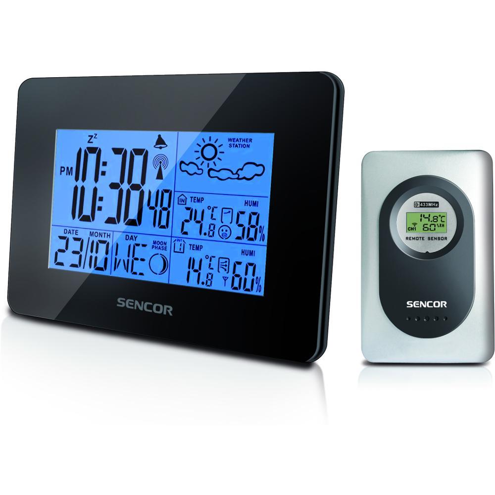 Sencor SWS 51 W je bezdrôtová meteostanica v čiernej farbe, ktorá okrem klasického merania vonkajšej teploty zvláda merať aj interiérovú teplotu, rovnako ako aj vlhkosť. Na veľkom displeji s modrým podsvietením sa navyše zobrazuje ešte budík s možnosťou opakovaného budenia, fáza mesiaca, dátum, deň v týždni a presný čas, ktorý je rádiovo riadený.